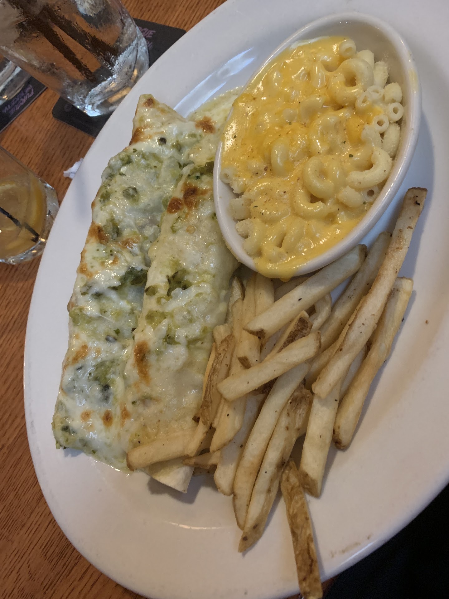 The "cheese and macaroni" and smashed potatoes were warm, flavorful enough, and significantly better than the steak and sauce.