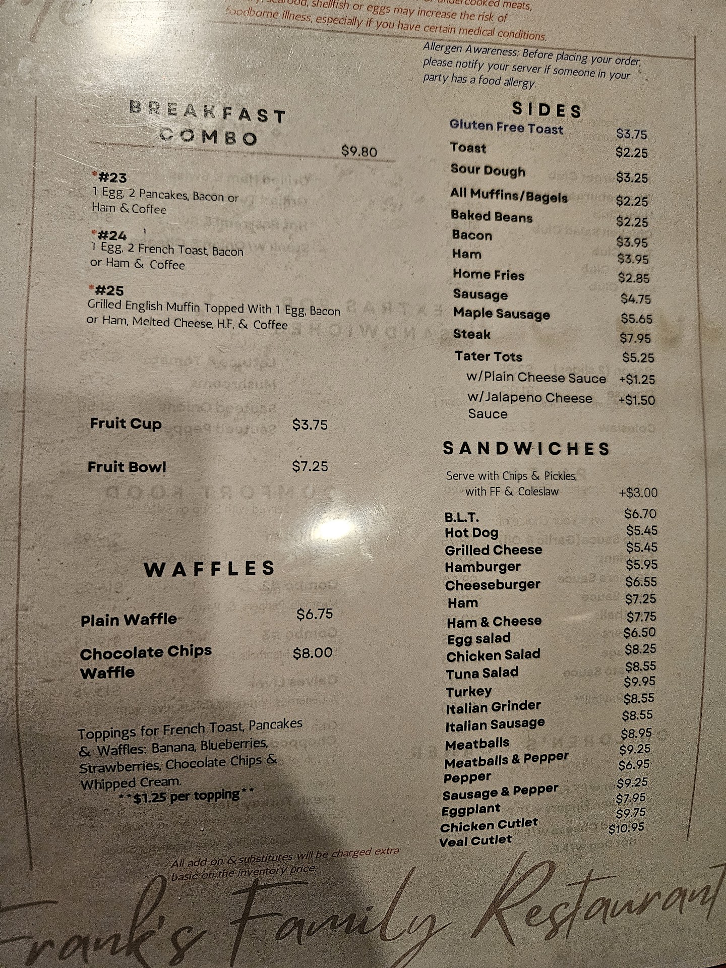 Read moreFirst is that the place smells like urine the waitresses are very rude and if they are not touching their nose their coughing on you ,,, but they do they have their favorites not all they treat rudely Also the food is to pricey and not enough and they charge u for every single thing like example my daughter asked for a little spray of whip cream that was an extra fifty cents the last straw was when my daughters and I were waiting for twenty mins to be served and instead she went to a table who came in after us and took their order I’m done with franks ,, but if anyone is looking for a good breakfast place go to SHANNONS COUNTRY KITCHEN in Lincoln the price is less and the food is more and absolutely so good best breakfast I had in...
