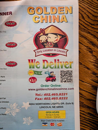 Read moreOrdered Cashew Chicken, Kung pow Chicken and peanut butter chicken and a side of crab ragoons. The cost was over $30. Got home and made our plates, after the first bite i realized my Kung pow chicken was not spicy at all and was mostly celery and carrots, my wifes cashew chicken had the exact base vegetables as my kung pow chicken. Both dishes were very bland and veges were under cooked. The peanut butter chicken was one of the worst ive seen or tasted in Lincoln, very soupy like and a very strange flavor. If your a peanut butter chicken lover stay away from Golden China! We usually order from Mings and have had good experiences but tonight we decided to try golden China.. huge mistake and a waist of money. If you want good Chinese in that area go to Mings NOT Golden China. 2 thumbs down. Oh and the Crab Ragoons were...