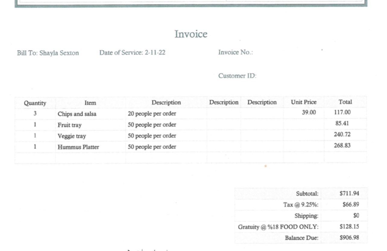 Picture of food table. This is what I ordered and what they consider to be $711 + worth in catering! No refills on the trays. Definitely will not be back to Grata following this horrible ownership and...