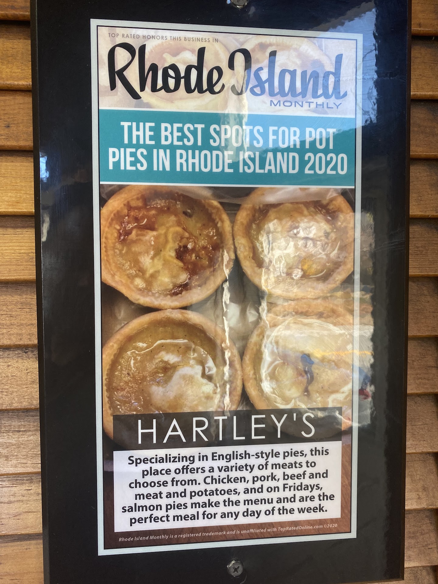Read moreReally great traditional meat pies in a stand-up hot-water crust. What you get is the authentic taste of excellent meat. No frills, no fillers, no exotic spices. In a town with awesome Asian, African, and Latin fusion cuisines with genius chefs constantly reinventing your palate, Hartley’s brings you back home to the tasty meals your great-grandmother prepared in her kitchen. Think of it as New England soul food. Think of your great-grandfather pulling a warm Hartley’s pie from his overcoat pocket halfway through loading a ship with blocks of ice on the Providence waterfront. Be ready to visit Hartley’s. They are cash-only, with three narrow steps up from the sidewalk. They are only open until the early afternoon, and only a few days a week. There is no place to eat your pies, and no restroom, so take them...