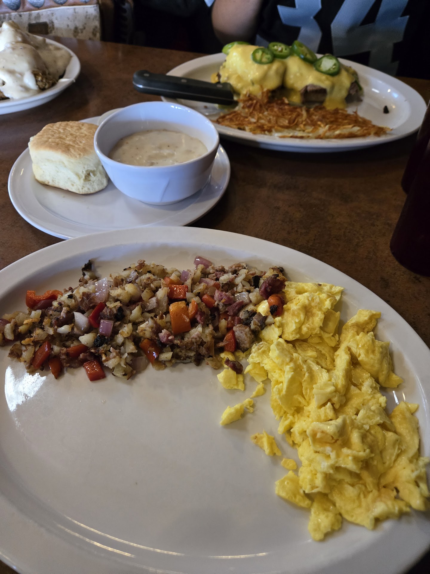 My wife and I went for breakfast this morning. We went early to beat the weekend breakfast rush. I have eaten at the location before when it was a different breakfast place. I like the way that the decor has been changed, and that it is a smoke house feel. Although we went for breakfast, we checked it out for lunch or dinner on a different day. The place has a bar, and also live music some of the days of the week. I had pork belly and eggs, and my wife had beef brisket and eggs. We made a couple of substitutions to our breakfast, which they cheerfully changed. Both of our meals were great. I am a backyard smoker, so I know a little about smoking meats. The brisket we had was the 2nd best(mine being #1),we have had. The brisket was flavorful and moist. This place beats the other smoking restaurants and food trucks in the area. The pork belly was great also. It was crispy outside and moist on the inside. Both are served without being drowned in sauce to cover imperfections. They are served with BBQ sauce on the side. The BBQ sauce is also good, buy I like my brisket and pork belly dry, without sauce, to get the flavor of spices and meat. A note for people saying the food is bland, it might not be seasoned to your liking, but I felt it was seasoned well. It's hard to season food to match everyone's taste. Breakfast is currently be served on weekends before 1130 AM, then it's lunch.