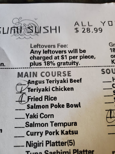 Read moreBeware!! Parties of five or more are automatically charged 18% gratuity, which gives the staff the ability to give poor service and still get a great tip. This was not brought to our attention and we didn't notice prior to paying, thus when the waitress put the charge machine in front of us when it was time to pay we tipped additional unknowing. So this terrible, awful, no good service was double rewarded! đ”âđ« This was a Sunday at 730pm and the restaurant was not busy! We pondered our menus a full 30 minutes before we met a waitress and got waters. The bottle of wine we ordered was plunked on the table unopened. When waters did come they were never refilled. When we pointed out to the waitress that we did not receive the side of rice that was supposed to come with our meal her response was, "Well you didn't pay for it!"đł But... it was supposed to come with meal!? The teriyaki salmon came out completely dried out and over cooked. They offered to remake it but the second time was marginally better. I didn't mention it a second time nor did the waitress return to ask how it was. When I tried to reach out to a manager the next day, I was told the manager wasn't available. It seems a manager is rarely available as I called 4 days in a row before I was finally able to talk to a manager. (One host told me "they take days off too, you know!" when I mentioned I had been trying to reach a manager for several days.) After listening to all of these issues the managers response was, "sorry, I'll talk to the staff". I will say the sushi was very good, but I've had better service at fast food places!! Keep your expectations low and do...