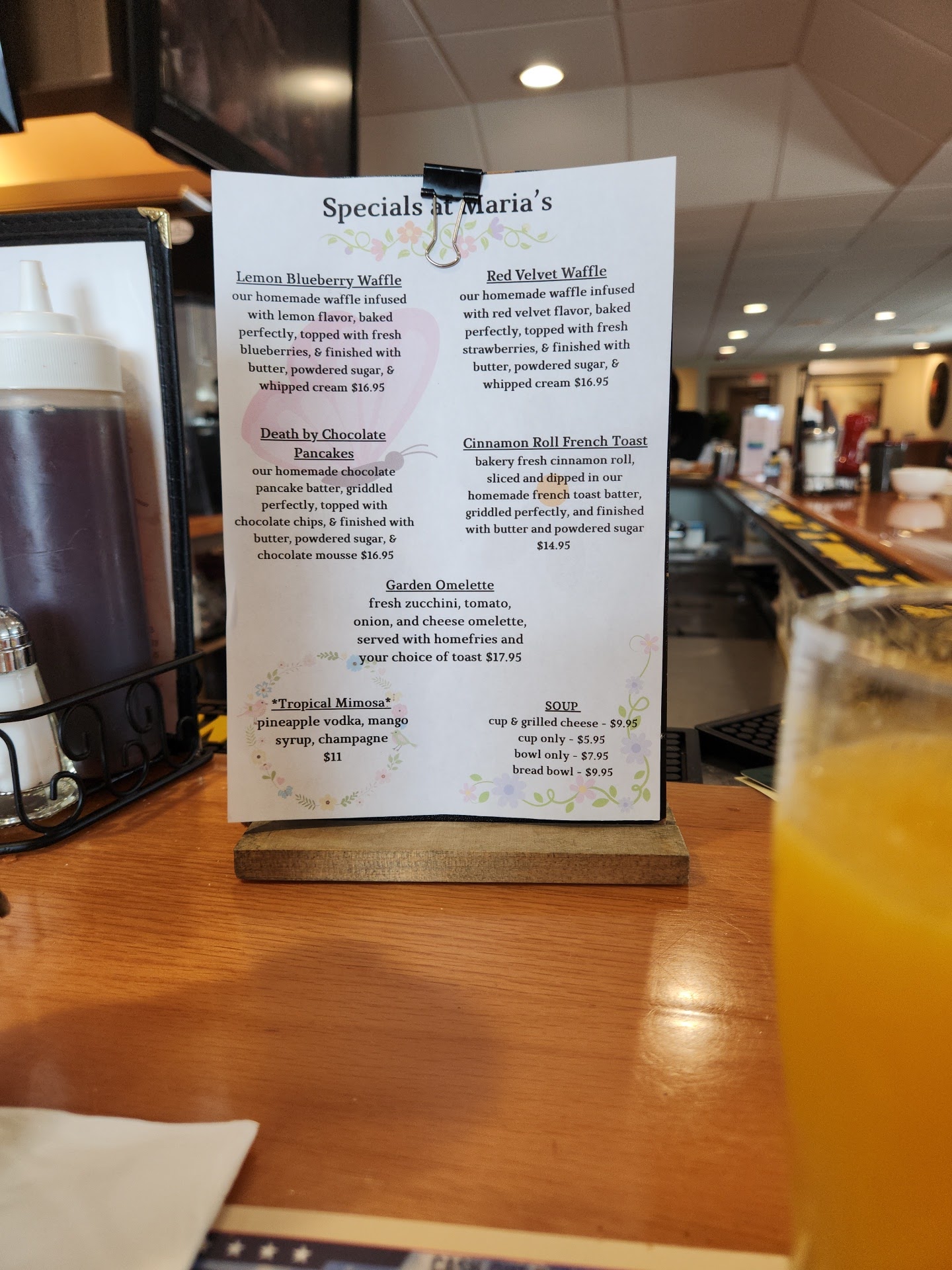 Read moreA gave this a 2 stars for the location in the picture when I went to Maria's original location in the picture it was run down the food was mediocre and the service was okay. Now I went to they're new location wow what a difference it looks like an I Hop version just a little smaller very nice though I think they have a few kinks to work out on service. They had specials that the waitress didn't tell us about, and it took her some time to wait on us. As for the ambiance it's kind of loud but nice and bright. The food was good the home fries were great please don't change the recipe but I ordered grilled onions with my home fries and got grilled onions on top of my home fries. I got scrambled eggs with cheese and it was melted goodness. The portions are big so either bring a big appetite or get ready to share...