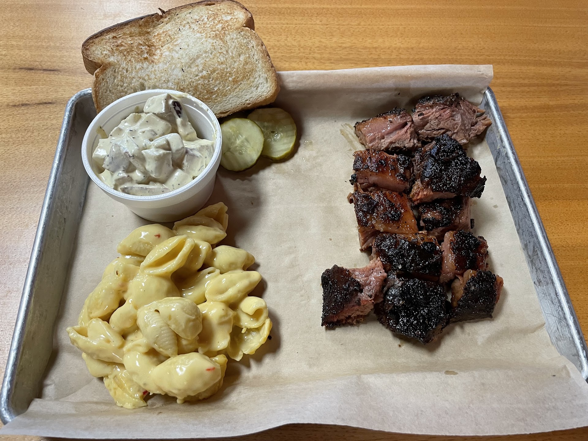 SIDES: Honestly, most of these really didn't have much flavor too them at all. They weren't bad, they just weren't remarkable. BAKED POTATO - Was good, just comes with butter, sour cream and chives, although I only had 3 chives on it. Be prepared for the butter to run all over anything on your plate though as you eat off a flat tray. BAKED BEANS - Had a real kick to them. They were good and more of the flavor style I've been seeking, but the beans didn't seem cooked quite enough and the kick was slightly more than I personally care for. MAC N' CHEESE - Got this for our 2 year old w/ his meal. He enjoyed it. Slight bit of kick to it, but not enough to turn him off of it. POTATO SALAD - Hubs said his potato salad was ok. Was spicy which he wasn't expecting, about a 6/10 on his scale. He said he'd get it again though. CORNBREAD STUFFING - This was one that all 3 of us enjoyed. I normally can't stand yellow cornbread, I grew up on much sweeter and less course white cornmeal, but this was actually really pretty good. A slight sweet hint to it with actual corn kernels blended in. We recommend this one and would definitely get it again. CHEESY POTATOES - We got a large side of this because one reviewer said they were to die for and it was something we would all normally eat. Sadly, there wasn't much flavor to them at all. Again, not bad, just not remarkable.