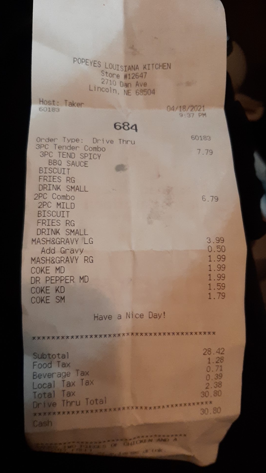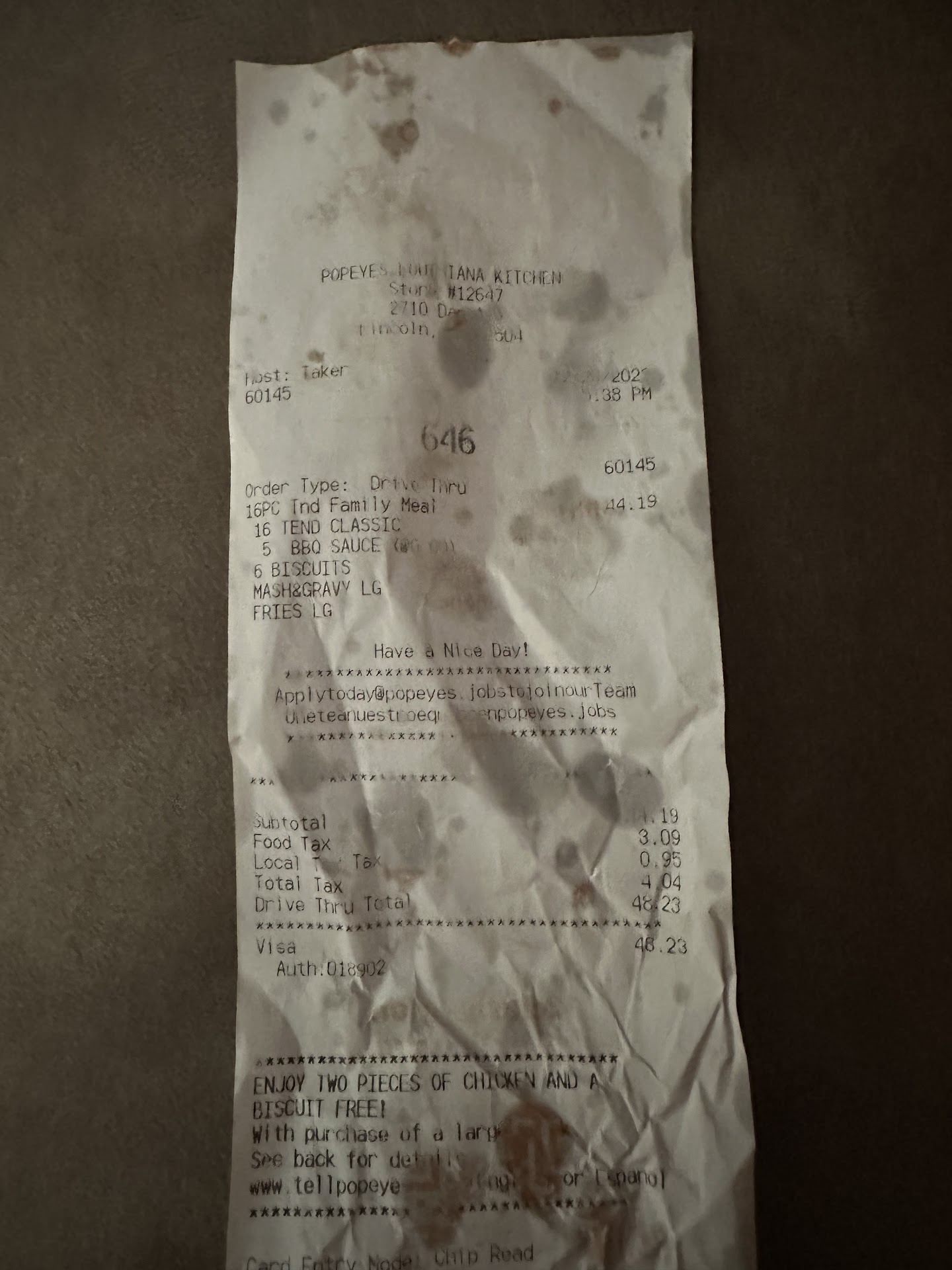 Read moreWe usually go to this location when eating Popeyes. Never really had any issues. Staff may have forgotten honey or dipping sauce in the past, but nothing that would have ruined a meal. Tonight was a different story. When we arrived (around 6pm) to the drive-thru we were the only customers. We ordered our food (3 meals all chicken strips with sides) and were asked to pull around to the window. We pulled to the window, paid, and were given our drinks. We asked if we could get ranch, blackened ranch and honey with our food also. We were told yes, and asked if we could pull to the front into a parking stall and our food would be brought out to us when done. We waited about 10-15mins, before our food was brought out to us. We looked through our order before pulling off. Our order was missing a side (mashed potatoes no gravy) , ranch and honey. I went inside to get what we were missing. The staff was confused about what I needed. I even showed them what I had in the bag that they gave me and told them what I was missing. Finally one staff member told me they were out of mashed potatoes, but they could give me potatoes with gravy only (already had sides in containers). An customer came in with her order when I was leaving, she was complaining her chicken was not fully cooked and juices were oozing out of it. I kept walking and returning to my vehicle to go home. When arriving home and sitting down to eat the food was awful! The Red beans and rice wea burned, the chicken looked as if it could have been cooked longer, and the mashed potatoes (even with gravy) were very dry. The only good thing was the Biscuits with honey. This location used to be very good, but doesn't look to be that...