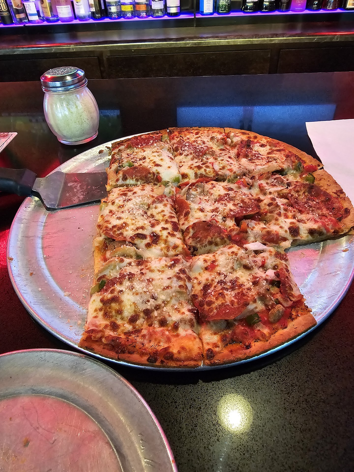 Entrees consisted of burgers, chicken strips, a medium pizza, and the hot dog. Everyone enjoyed the burgers and two had good things to say about the mac n cheese side they got with theirs. The chicken strips were good, just normal 'bar food' chicken strips. I had the Red Zone Pizza which was good but not what I was expecting. I thought it would be like a buffalo chicken pizza since 'red zone sauce' is an option on their wings, but it was more of a vinegar based sauce that while tasty, just was not what I was expecting. The pizza is on very thin cracker type crust and next time I'll try a different version of it.