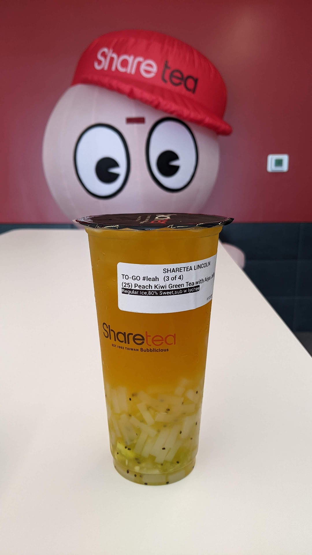 Read moreSharetea is a bubble tea shop, no food. Unlike other bubble tea places that use powder and syrup for flavoring, share tea uses jams with fresh fruit bits that give it a more refreshing taste. Favorite so far has been the peach kiwi fruit tea with lychee jelly (instead of the aiyu jelly that it comes with). Lots of great flavors and options, will...