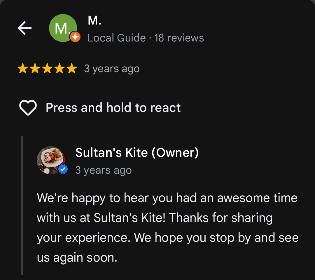 Read moreAnother Bourbon Show 🤘🤘🤘 we wanted to park and eat within walking distance. My husband's eyes light up when I mention Gyros! It's been a minute since we've eaten at Sultan's Kite.