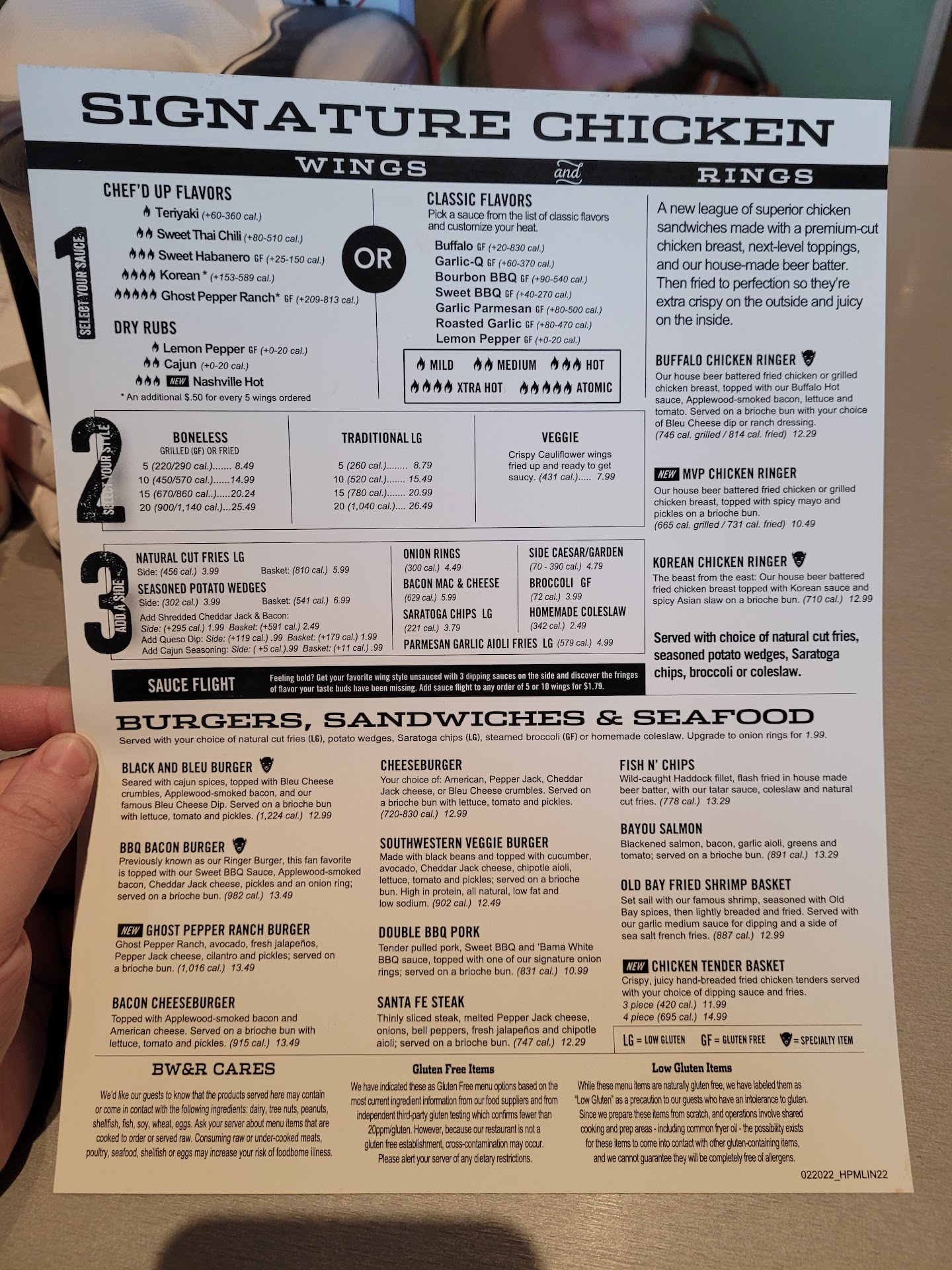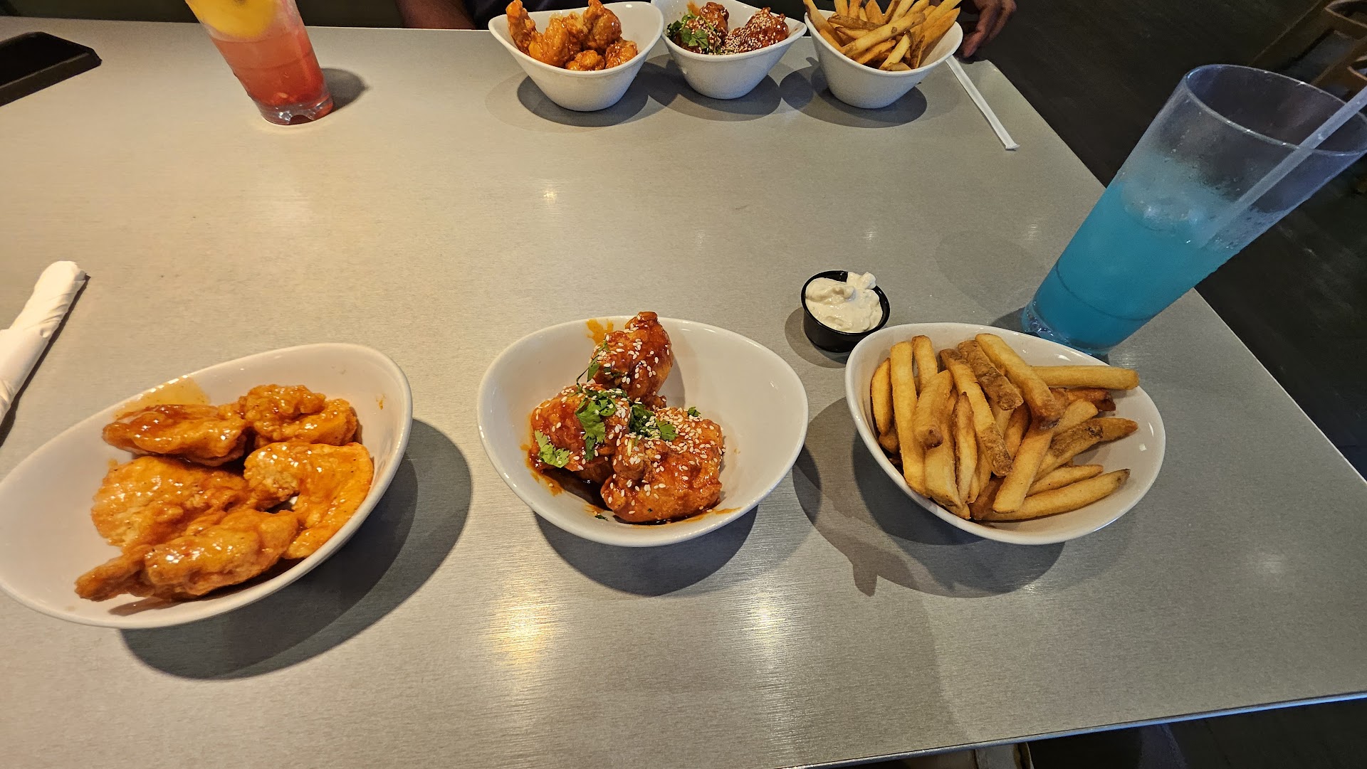We were told it would be a 30-minute wait. No big deal, the place was packed. It actually took less. Once we were seated, our waiter came up and asked what we would like to drink. He took my drink order and ran off and got it, never asked what my boyfriend would like to drink. He came back 5 or so minutes later and asked if we were ready and what we would like. We started off with Fried Pickles for an appetizer but they were out, so then we decided to get their Chips and Salsa. Our waiter said he would go put the order in, never gave us a chance to place our main course since we were ready. He ran off and took another tables order. The only positive thing that happened was a manager brought us more chips when we were out. We waited probably 45 minutes total for our main course. After our waiter brought our food out, my boyfriend thought the waiter just messed his order up because he asked for Saratoga Chips for his side instead of fries but his plate had fries. I bite into my wings and tasted cheese and lots of garlic when I had ordered the Buffalo Mild wings. So we both got the wrong orders. Not more than 5 minutes later a kitchen worker came out with OUR actually food. We told her we were just given the wrong food but we had already dug into it thinking it was ours. My boyfriend then asked the kitchen worker if he could get a beer just as our waiter then walked by. Our waiter then had to go over to the couple catty corner from us and explain to them that he just gave us their food and they’d have a little bit longer wait. The Saratoga Chips were supposed to be seasons and weren’t, they had absolutely no flavor to them. The wings tasted like they had just been taken out of a warmer. The breading was soggy and the sauce was not very good and neither...