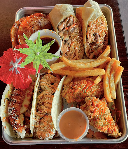 The mini monster tray comes with 2 vibirria tacos, 1 viet-taco, 1 shrimp tempura taco, 1 hibarito, a side of fries, and 2 wings with the sauce of your choice.