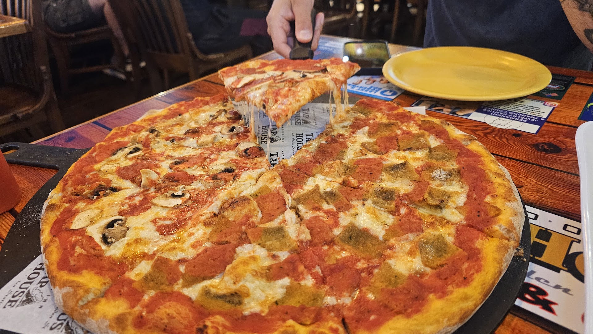 Upon arrival, as first-timers for some of us, the walls are lined with pine filled with fitting memorabilia, and the large bar has a funky, haphazard shape with their 40 TVs.