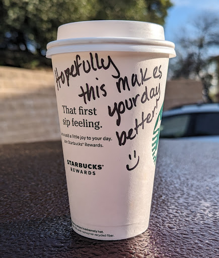 We drove all the way from the East Coast to come see the Sequoia Forest. When we got to the park gate, we were informed we would need chains on our tires if we were to see the trees. With it being so late, we had no time to get chains for the tires and thus, had to turn back. Needless to say this was a great moment of sadness, as seeing the Sequoia Forest has been a lifelong mission. In order to ease the sorrow of this great loss, we decided to get a treat at Starbucks, this Starbucks. We got there and a wonderful woman took our order and listened to our brief lament about how we lost out on our mission (This was Monday evening, March 31, 2025). Her kindness and true leadership literally brought us out of our slump and made our day. Please treat this wonderful woman really, really good as she is the ultimate leader. We can't thank her enough for her kind, much needed words and wise, wise initiative! And yes, we are keeping this...