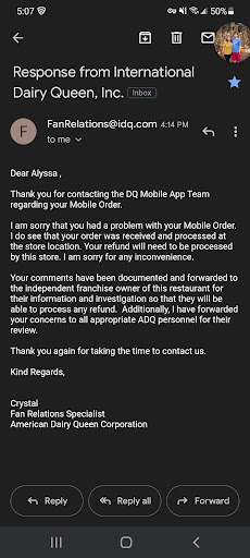 Read moreI used to frequent this dairy queen but unfortunately the service has gone down hill. Yesterday 8-21 I arrived at the drive threw at approximately 744pm. Figure long line no big should take about 10-15 min. Finally ordered my food after 10. Got to the window and the guy who looked either hung over or coming down took our total and tried handing me a coke. We substituted the drinks for a shake and blizzard. We also got curds instead of fries. Sat at the window waiting for the curds and ice cream. The guy tried handing us our burgers and that's it. We get the curds finally and I mention the ice cream. Apparently when you substitute a drink for ice cream it doesn't show up on the ice cream screen. Now I got 2 soggy burgers, cold curds and he hands us 1 dripping mess blizzard and the shake. I ask for napkins and he hands me a sticky wad. Not a stack and wad. Also, I mentioned to the cashier about the substitute when he tried handing me the coke. Why didn't he ask or tell someone to start making the shake and blizzard. Ita right on the screen. We finally left the drive threw at 833pm. Super unorganized and unprofessional. It never used to be this way. Figure...