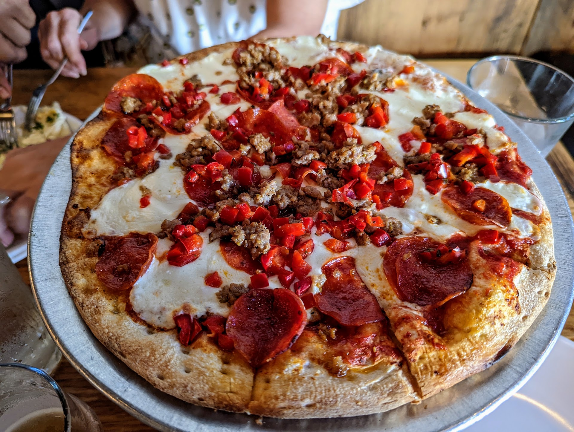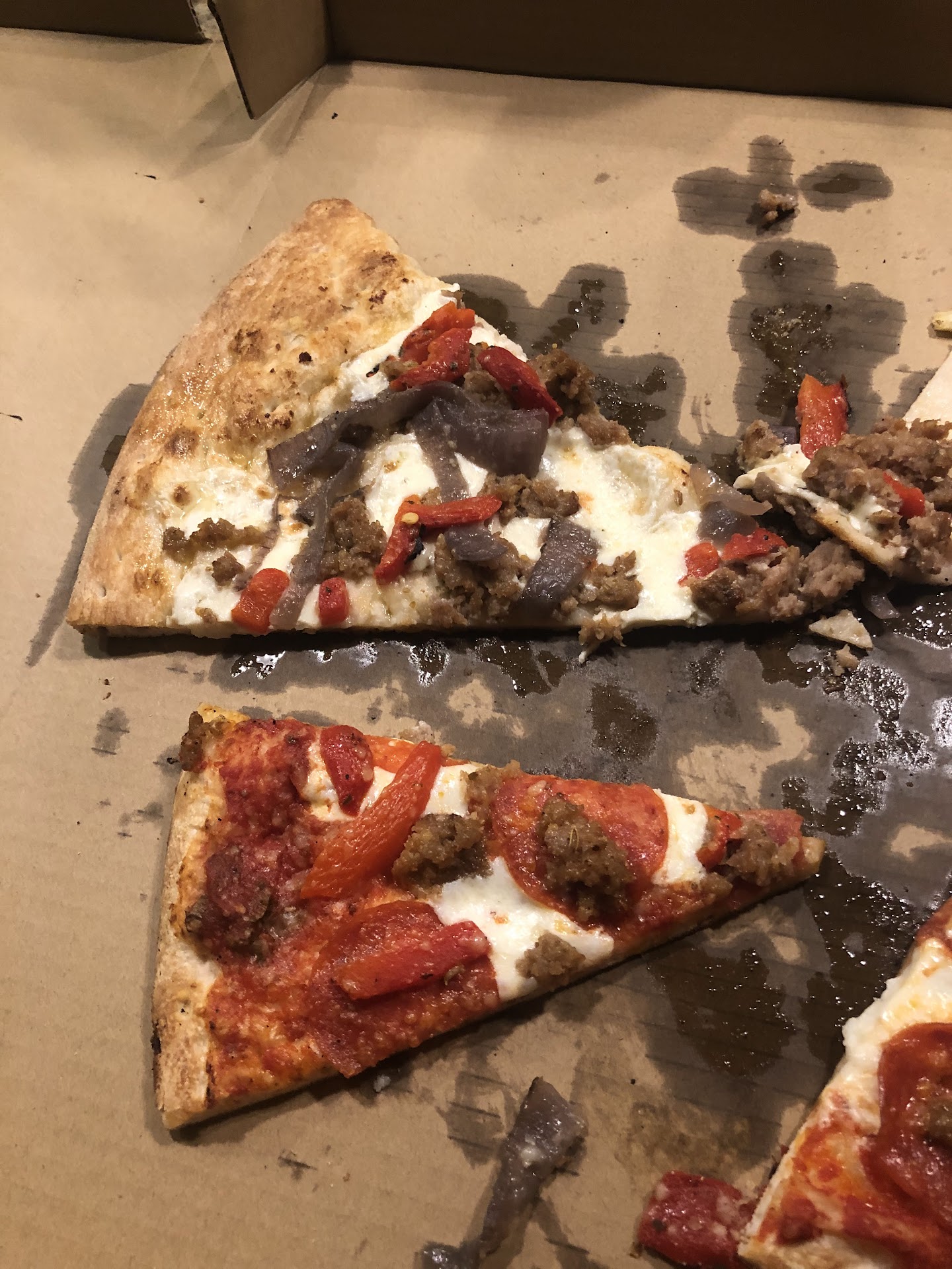 That leaves us with the last element, the toppings. Some of the toppings were fine. The ricotta, sausage, cheese, pepperoni were all good. The onion has a very unappetizing purple appearance and tasted of nothing. There was an over abundance of red peppers, which were also tasteless.