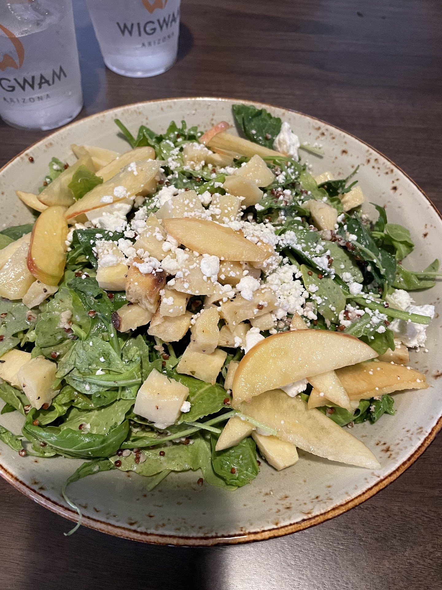 The inside is a bar type scene with multiple tvs mounted on the walls playing sports games. It's decorated in a somewhat rustic southwest style much like the Wigwam resort. The bar is well stocked with low to midrange drinks. Their beer selection is decent with a handful of microbrews you'll probably already be familiar with. The appetizers are simple bar food but tasty with some of the best fried pickles I've ever had.