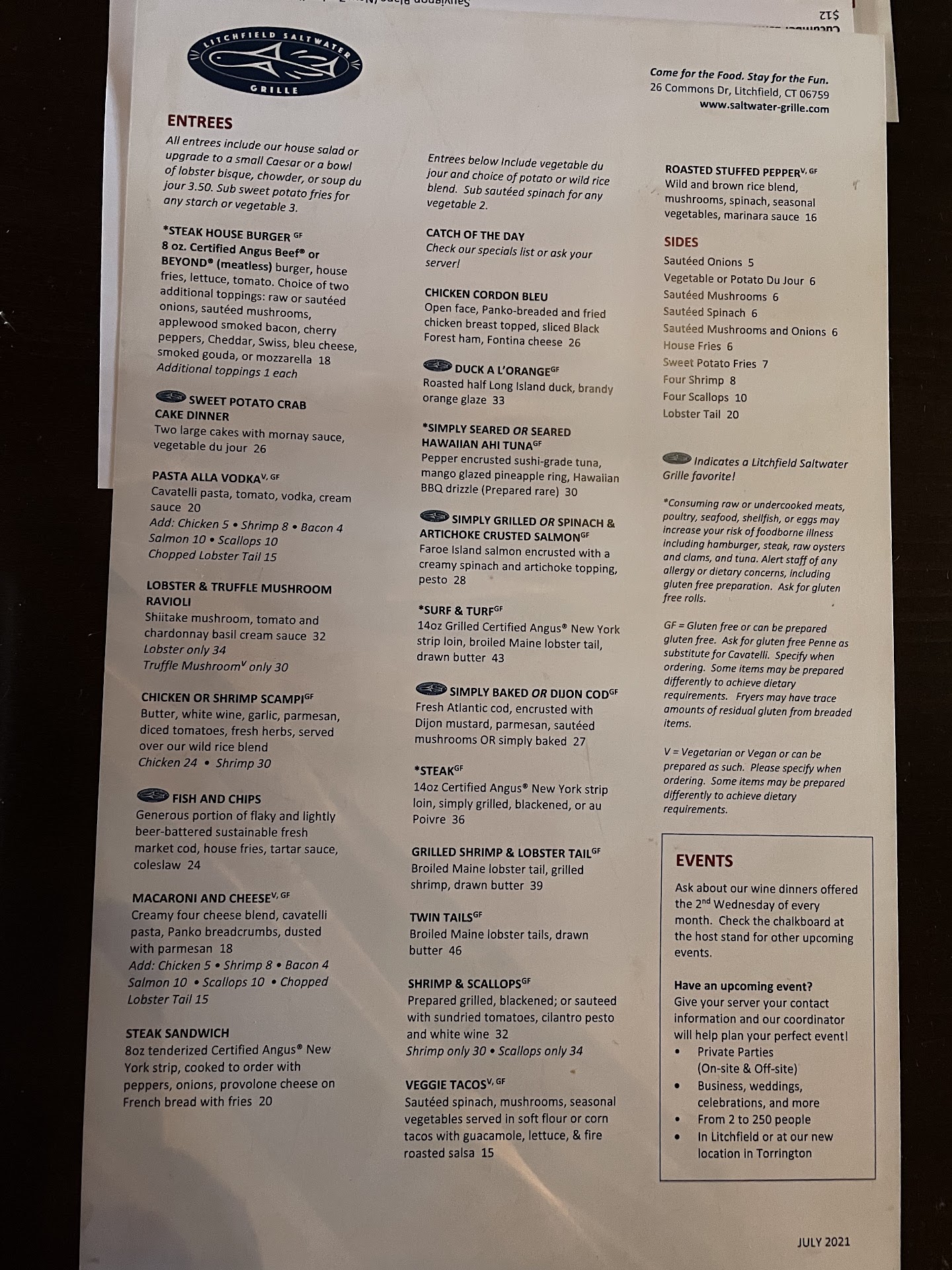 It's surprising to me it's been so long since we've dined at Saltwater Grille in Litchfield because their food is incredible. Covid probably added to the gap in time, so we were happy to finally book a reservation for their monthly wine dinner this November. This month's five course menu sounded perfect: