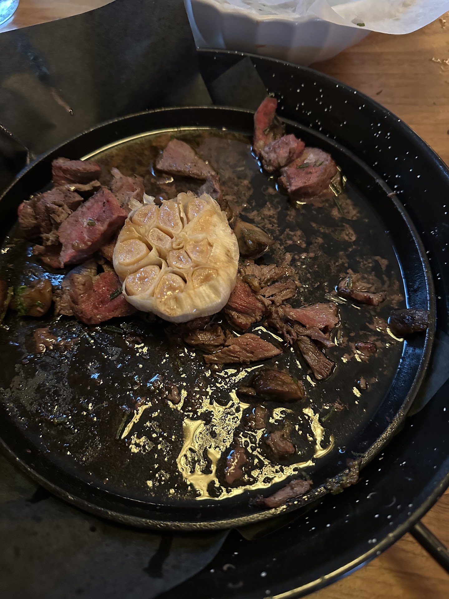 The description for the top sirloin is 16 oz. sliced thin, browned butter, rosemary. I guess I was expecting a plate with the sliced steak and browned butter and rosemary drizzled over top. And I was surprised when our server didn't ask how I'd like it prepared. I normally like medium rare. That should have clued me in. Instead it came out sizzling on a cast iron plate....which means that the meat continued to cook and much of it was brown through and curling by the time I got to it. Also, I thought it was sitting in oil. But apparently that was the browned butter. Nothing about my meal suggested browned butter had been used with it. Overall it lacked much flavor at all. And I kept wishing there was salt at the table.