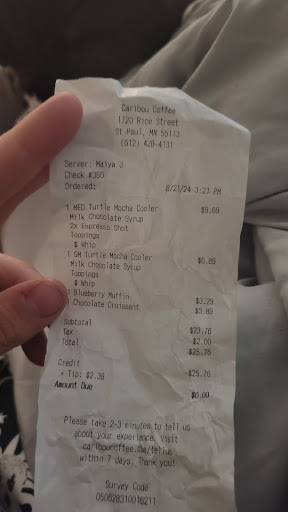 Read moreCaribou has always had terrible bakery options, Apparently they don't realize how important bakery is to coffee, out of all of the bland and bad quality ones 1 or 2 are rescuable, always out , got rid of the oatmeal chocolate chip cookies, got rid of the Chocolate chip coffee cake and also got rid of the only sandwiches that had any quality... it seems like they've started to go cheap about their products and They weren't all that great to begin with, so now the coffee is basically the only thing worth a penny and 1 sandwich out of all the grease menu options, however, you can't even order a salad with your grease buns or grease biscuit forget adding a tree leaf to a your tiny $5 grease chunk, "they come like that from the Warehouse and cant be modified" according to workers, great job