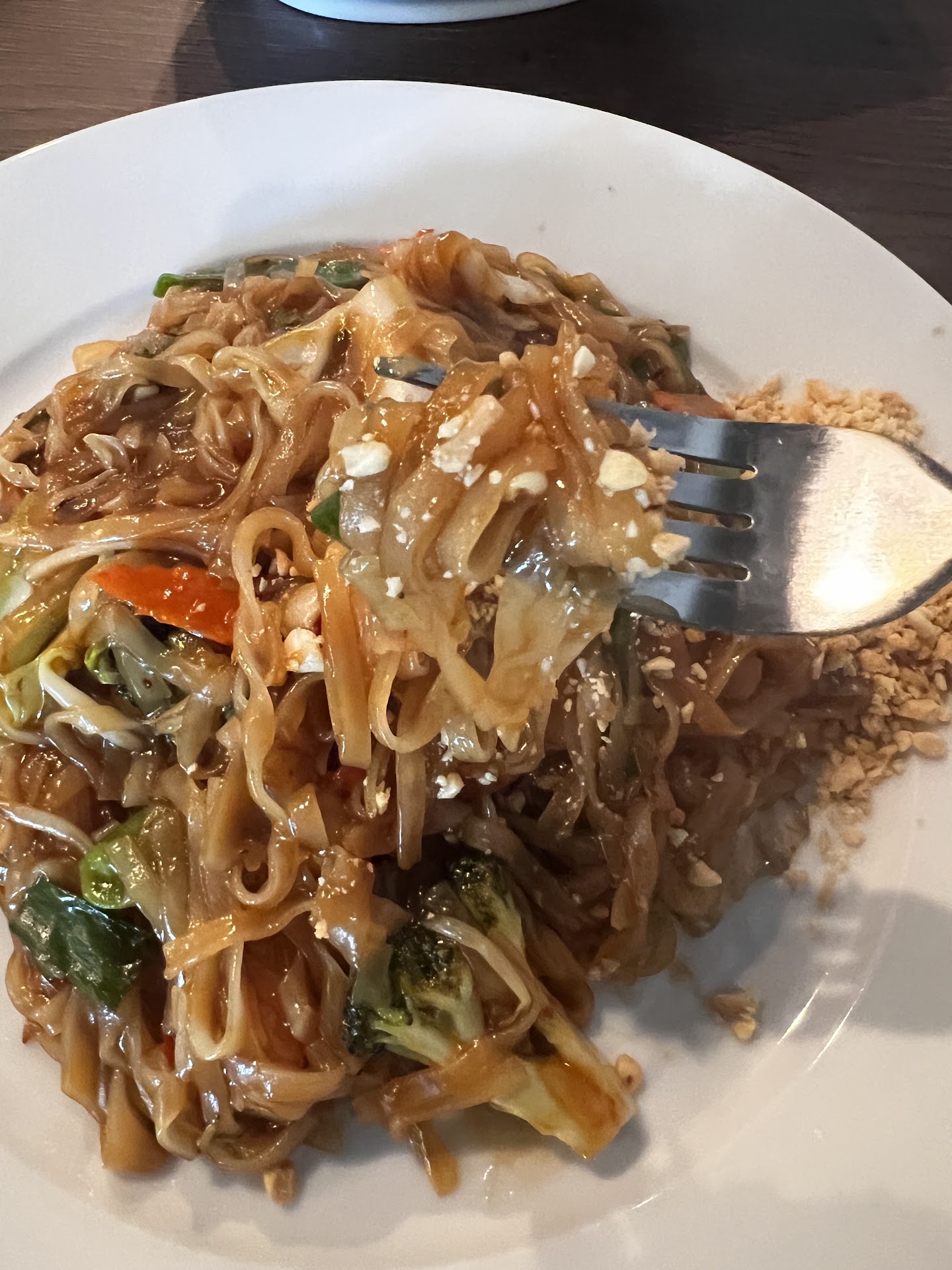 Read moreMy boyfriend and I went here tonight. We ordered fried veggie dumplings, sesame chicken with steamed veggies added, and pad thai with tofu (I’m vegan, my boyfriend is not). First the dumplings came out steamed, which we agreed to go ahead and eat because we were hungry. They tasted like they had ground meat in them, which was suspicious since they weren’t the dumplings we ordered in the first place, but our server assured us they were the vegetable dumplings. Also the steamed vegetables my boyfriend ordered worth his sesame chicken came out with the dumplings instead of with the entree. The entrees came out very quickly, while we were still eating the dumplings. My pad Thai tasted just fine and was spiced according to my order. However, my boyfriend’s chicken tasted like frozen chicken nuggets and was not spicy at all and he was not happy with his meal. He told the server he was not happy with the quality of the food and sent it back after two bites. The server took the chicken away and got me a to-go box for my meal. When she brought us the bill, the chicken was still on the ticket. We pushed back against this and asked to have it taken off the menu. This led to a very long and awkward back and forth disagreement with the server who insisted that we pay for the chicken. Eventually , she called the manager on the phone who told us that satisfaction is NOT guaranteed and that he did not want to take the item off the ticket. We have both spent 7+ years in the restaurant industry and feel that this is poor practice, but even so, communication could have made us feel better about this situation. The server could have asked if there was something else he would like to order or told us that we were expected to pay for the item regardless of our satisfaction before she took the food away. Overall, I appreciate the marked vegetarian options and I’m sure that the other Thai options are higher quality than the Chinese option he ordered, but poor customer service and communication are ultimately what ruined this experience for us and we would not recommend this...