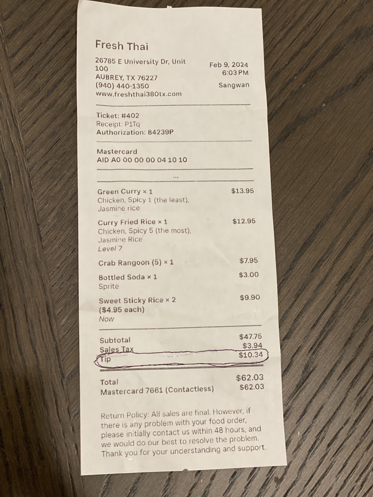 Hello everyone. I wasn’t going to write this review initially, but my conscience is not letting me do that. So with that being said, here we go. On Friday(02/09/24) me, my wife & 2yr old kiddo went to dine in. We walked in & waited to see if anybody acknowledged or noticed to help us find a table somewhere. Since we didn’t get anybody to seat us, we went ahead & sat ourselves in the one of the many open tables. No biggie. Thought it wouldn’t hurt because there were so many open tables. At the time we went, there was only one customer eating in the dining area. Eventually, a gentleman came over & put menus on our table, no greeting, didn’t say a word or gave any kind of acknowledgement. Then he came back with lukewarm water with no ice in halfway washed cups & i’m not exaggerating. He then went away for a bit & eventually came back to take our order. Food came out and it was pretty decent. I’m not writing this review to critique or complain about the food, but just principles. I’ll get to that part shortly. Although the sweet sticky rice could use a little bit of work, since it was dry. After/while we ate our food, our server never once came back to check on us. Just to ask how the food was or if we needed anything. Mind you, if it was a busy time, I’ll completely understand. There was a young lady working at the same time also. She came to us eventually, made sure we were good & was very polite. After our meal was done, the gentleman came back with our receipt, again didn’t ask us if we needed anything, just robotic. And this is when I noticed something on my receipt. I wish I had the original ticket where it said “gratuity 20%.” I only have the copy of the receipt after payment & it only says “tip” instead of “gratuity.”(PIC ATTACHED) I questioned the gentleman regarding the gratuity. He said that “we charge 20% gratuity for all dine in now.” I thought this was odd due to the percentage & also the number of party dining in. I’ve seen places where they charge gratuity for a party of 6 or more people. But it is what it is. So here’s my problem/concern. You(Fresh Thai) is expecting/charging a 20% gratuity/tip for subpar service. I wouldn’t have been bothered as much if I’ve received decent service. Please don’t get me wrong. I believe it’s a tough industry to work in & those tips are earned through hard work & good customer Service. So I’m all in for tipping. I kept calm & didn’t want to be confrontational, since that’s not my style especially with other customers around. So I just paid & left. After I left, I recall seeing the same server giving an IPad to another customer for payment. I thought this was odd too since I was just given a pre printed receipt with a pre selected gratuity amount. It could be something or it could be nothing, just a thought. Moral of the story is if you(Fresh Thai) is charging people 20% gratuity, at least put forth an effort & give decent service. I definitely won’t be coming back again. Hope this review...