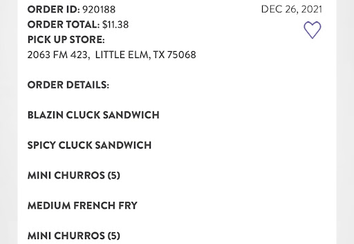 Read moreJust left the drive thru, there was only one car ahead of me at the menu board waiting to place their order, and 2 or 3 cars ahead of them that had already ordered. It took 22 minutes for me to get a chance to place my order. After that, about another 10 minutes waiting. I ordered the Blazin' Cluck, but received something with bacon and onion rings on it. The sauce has zero heat/spice to it. Not sure what sandwich I actually received. I'm not even mad about the wait time -- I didn't have anywhere to be and was in no rush, plus the lady at the window was nice and apolgetic for the wait, and I responded "no problem" since I was not really bothered by it. Alot of places are short-staffed nowadays, so I get it. I glanced at the wrapper that the food was in before pulling away, and it looked like the same wrapper that I had gotten before, so I assumed the order was correct...my fault. This poor review is for getting the order wrong and wasting my money on something...