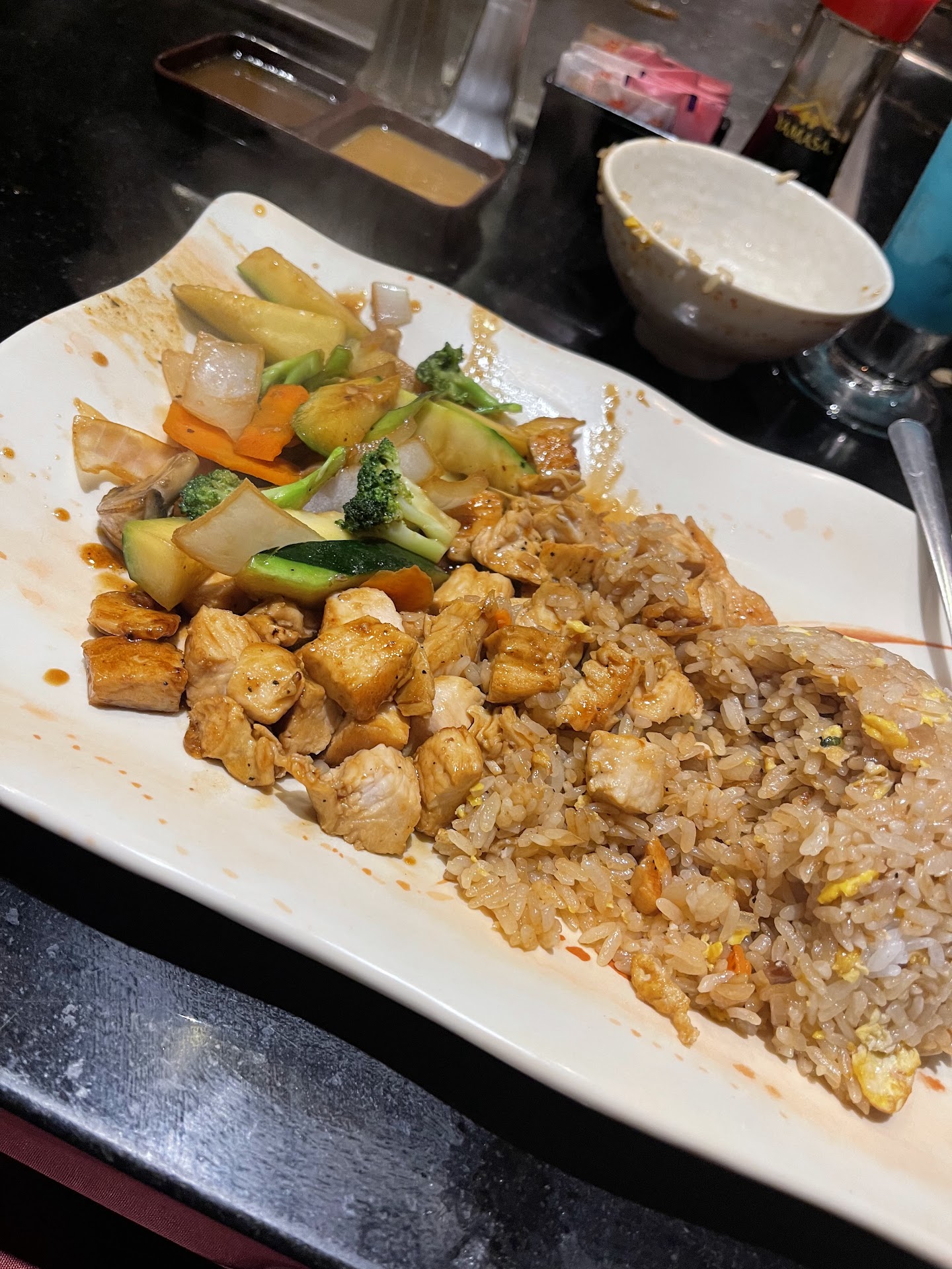 The chef was very good. Lots of fire tricks and that type of thing. The rice and food were very good - cooked correctly and well seasoned. The vegetable portion was extremely small. Most other places give you a whole plate of vegetables. I got maybe 1 cup of vegetables (by volume), which is hardly enough. I did, however, get a big portion of fried rice and chicken, so overall I had enough food.