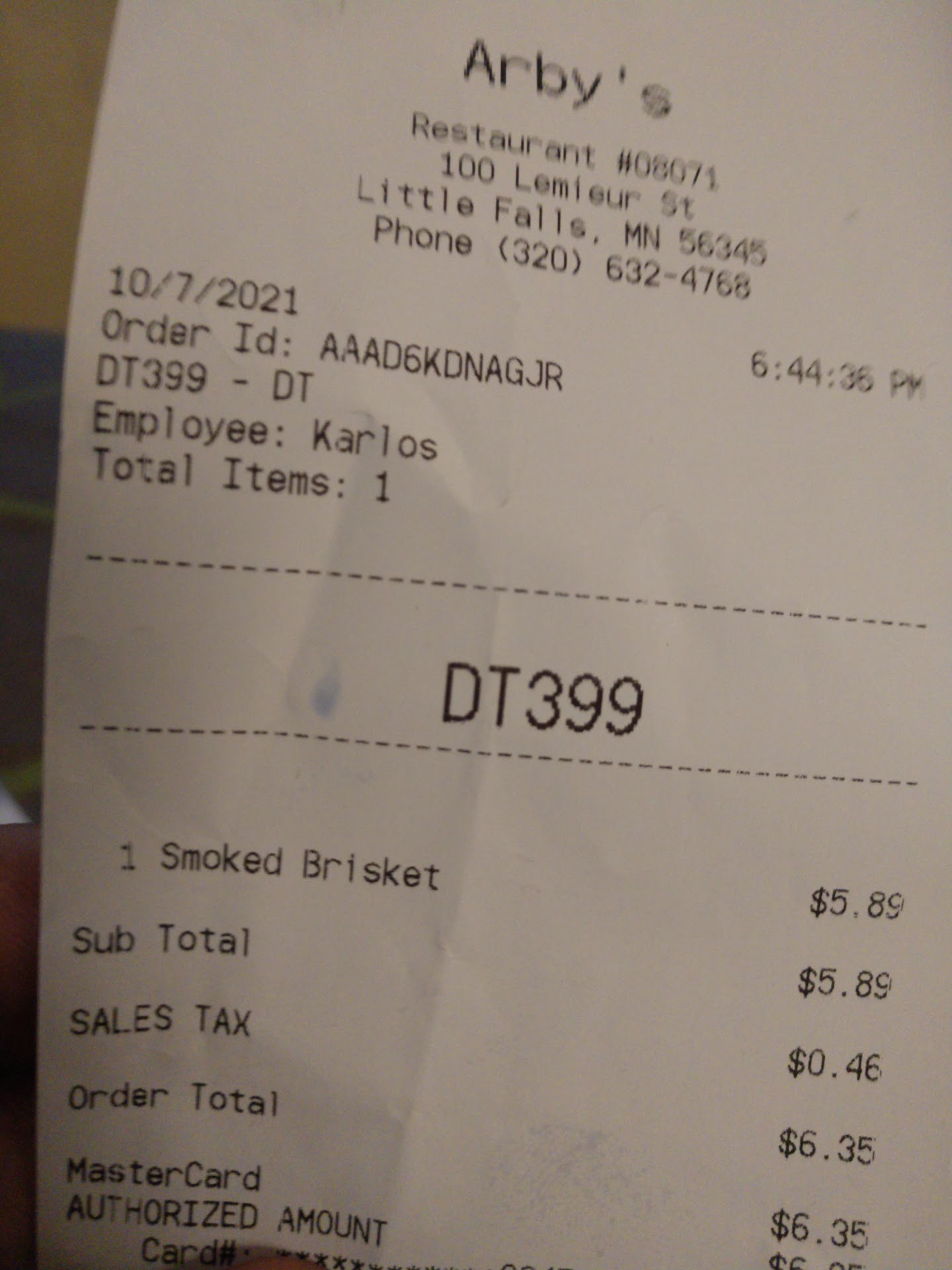 Orig below..... Working from out of state. Went to the drive-thru ordered a smoke brisket sandwich. The receipt clearly says smoked brisket sandwich $5.89 what I got was some thing with two pieces of chicken tender and a tomato and lettuce. Not happy Arby's but I'm too exhausted to drive back...