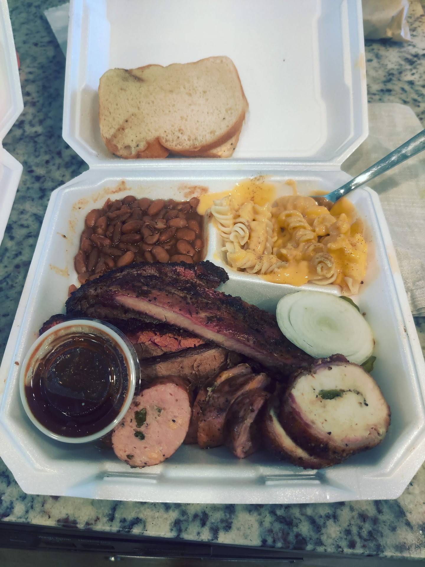 Read moreI have been wanting to try this place and when I think about it it isn't open. Well this morning I saw their Facebook post that they were open and since I was out already I headed that way. I was so excited to try the bbq . It's a good truck with a covered pavilion. Cute area. Picnic tables . We ordered the 2 of the 3 meat plate. Brisket, sausage, and pork ribs. It comes with 2 sides so we chose the beans and Mac n cheese. Everything was delicious! My favorite was the Mac n cheese!!!! The cheese sauce is so good! The meat was tender. BBQ sauce good. The bread slices we got were homemade. I'm so glad it was delicious. Prices...