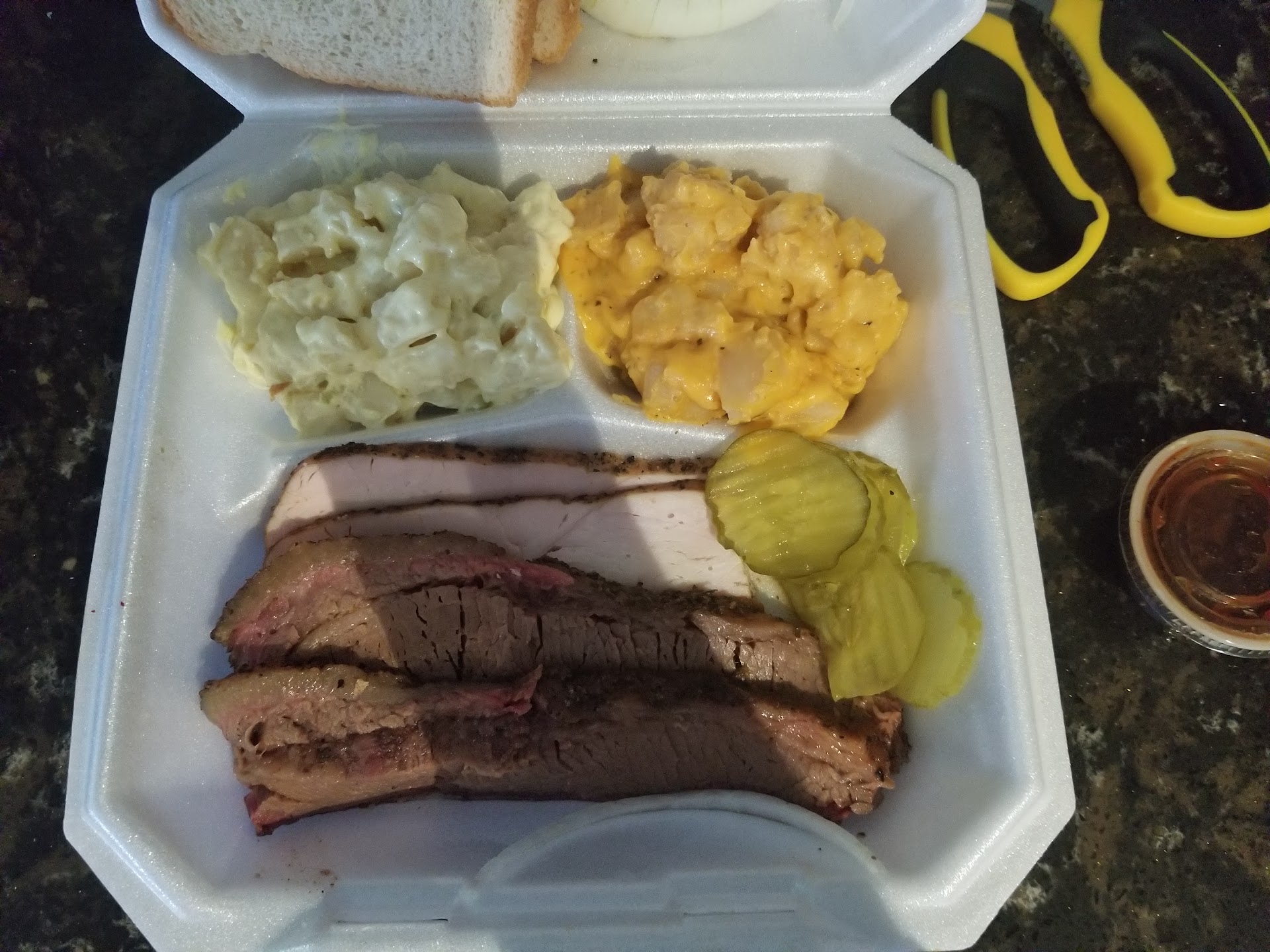 Read moreSIDES MATTER. I tried 3 different items here, loaded potato. Mac n cheese with brisket and 2 meats (brisket & turkey) & 2 sides cheesy potatoes and potato salad. This was almost inedible. The cheese that is used on everything tastes like canned cheese, which is a taste I cant explain. The baked potato was gooped up with it, I could taste meat or the potato. The brisket had no flavor and just crumbled. It had no texture. The potato salad was just cubed potatoes with mayo. This was just the worst 45.00...