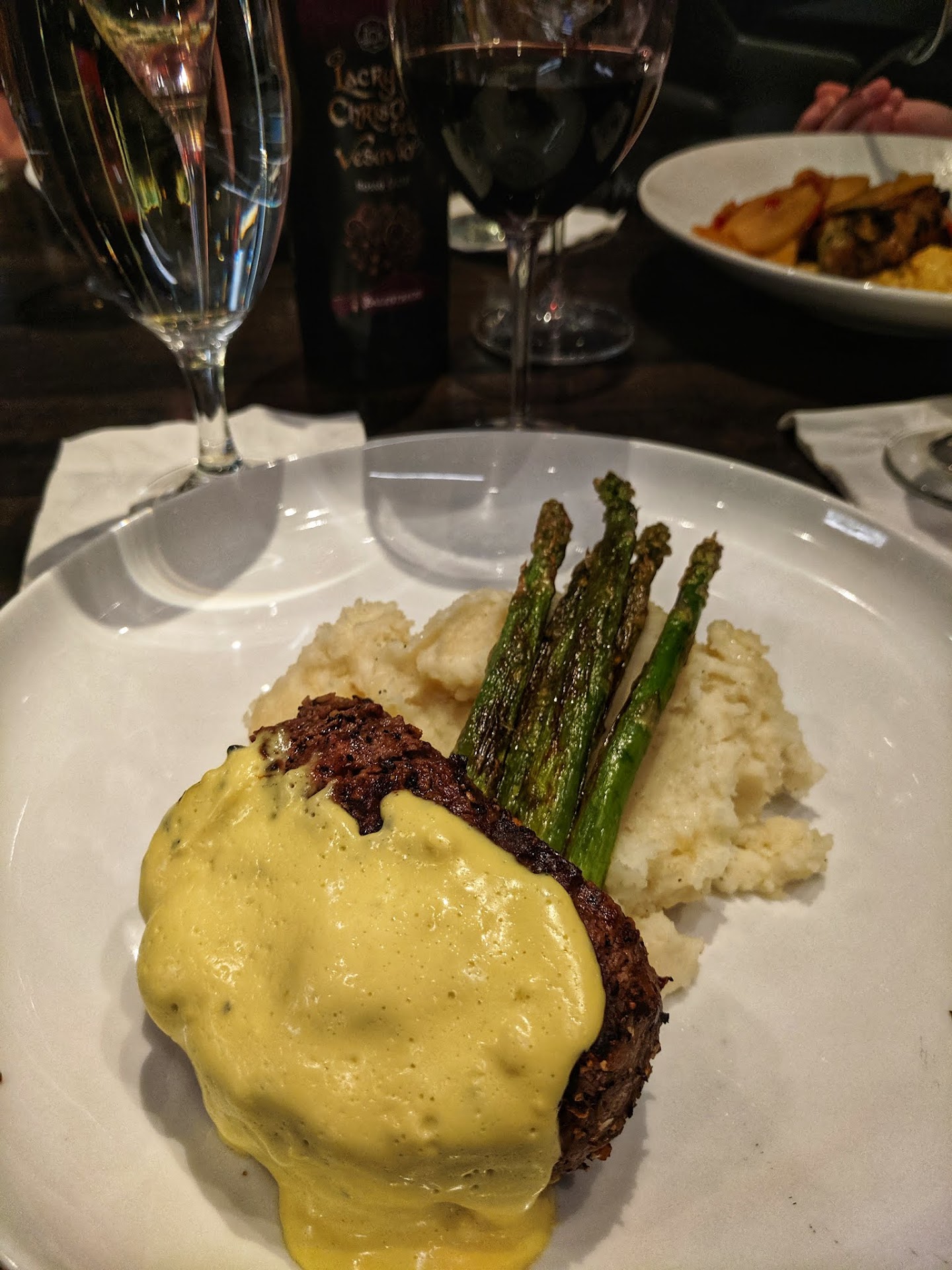 First let me say that the bartender was worth visiting again. He was nice, entertaining, and made a great negroni. Also, the filet was excellent. Those reasons are why this place gets 3 stars. It got dinged because our server actually complained about us bringing in our own wine(which I'm pretty sure is not illegal) and he proceeded to do a piss-poor opening and presentation after we told him we could just open ourselves if he was going to be so put out by it. UGH. He also vocalized his frustration at us paying and tipping the bartender before we sat down so that he missed that tip. Dude, you didn't mix our drinks and entertain us, bartender did. Bartender gets the tip. He tried to recover with light banter but had already lost us as an audience. Several slightly snide comments later he tells us that we were supposed to be one of his VIP tables(humble brag). Could have fooled us, buddy! I hate to see how he treats the rude tables if that were true. Also, we felt rushed. Here's the deal, we like to eat, drink, and talk and are happy to pay for the privilege to do so in your establishment. We do not want to feel unwelcome or hurried. The biggest hint that it was time for us to leave was when our server told us that we probably wouldn't want any of the desserts that he had left and he didn't want to bother the kitchen. OOOOkkkkaaayyyy. Never mind then. Turned out that the kitchen was not bothered a bit and sent out a sampler plate. And they were all good. Winner. Too late to order a cup of coffee though, it wasn't ten o'clock yet. Then the valet came up to our table, asked if this was the key to our car, tossed it on the table, and turned tail. Saved that tip money, I guess.