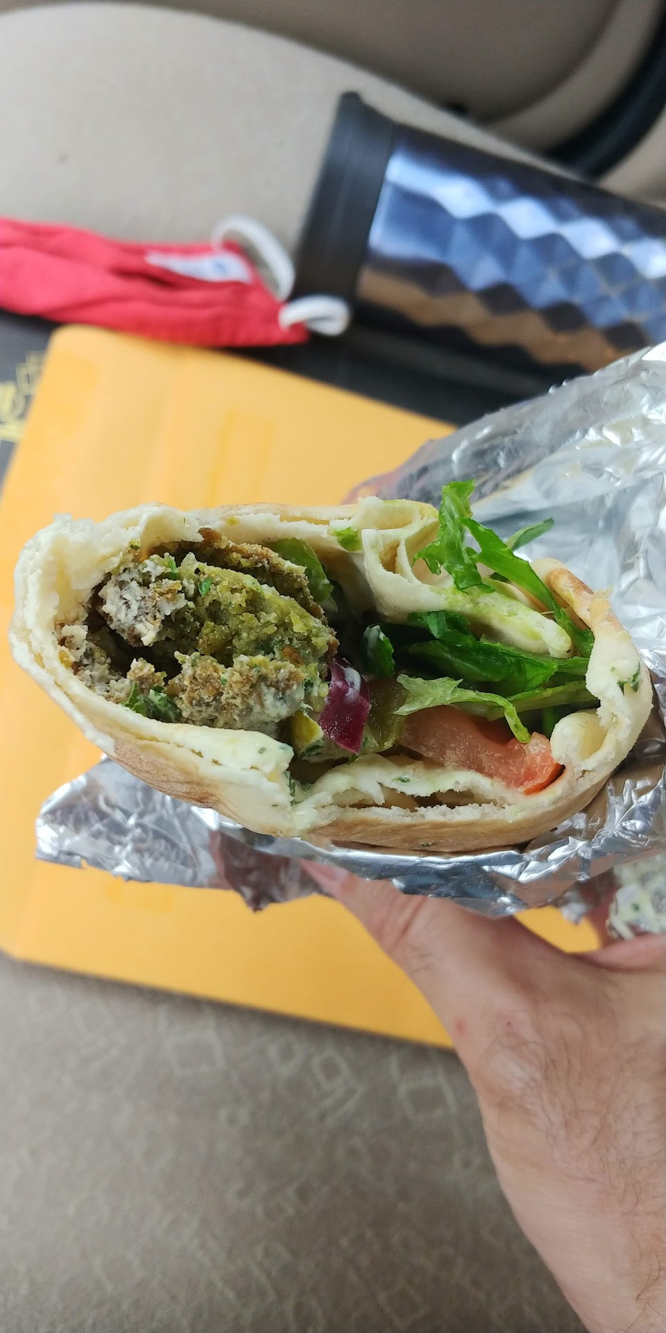 Read moreI finally tried the food here. Overall, 5 star. I regret not eating at the buffet at the restaurant. The man asked if I wanted it to go, but I should have stayed to eat more of the chicken in green sauce. Wonderful! Loved it! It seems to be an Indian recipe but maybe I'm wrong. The baba ganoush had a smoke flavor, like a hickory. I also had the falafel wrap. I'll use Zam Zam falafel as a baseline, which is the best of the best to me. These falafel wraps have pickles and onions whereas Zam Zam uses chilis and delicate mint leaf or something. This wrap has taziki sauce, I believe, whereas Zam Zam has maybe that plus some tahini sauce. I'll give them a close second place for the wrap but it was delicious. Overall, I'll go again eagerly but I'll arrive before 2 PM to really get in...