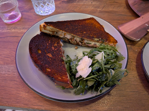 Read moreMy friends took me and boyfriend here as they love this place, it's one of their new favorite restaurants here in Little Rock. So, we had pretty high expectations. We were seated immediately and was given water to drink. We started off with The Board, which is something that my friends loved. It was pretty good. The sauces except the mustard weren't for me though, the bacon was pretty thick and pretty dry, which was a shame, but the prosciutto was pretty good, especially with a small piece of bread and the mustard. I ordered the Pork Belly Grilled Cheese with a side to share of the Lemon Herb Potatoes. When my Grilled Cheese got to me, it was unfortunately, kind of burnt, which sucked. The combination of the swiss cheese and pork belly were pretty good, but not great. I wish the pork belly was thicker and not finely chopped as it was, as I think that takes away the flavor of pork belly. The arugula salad was a plus though. The potatoes were also unfortunately kind of burnt as well, giving it a burnt lemon taste that wasn't that pleasant. Overall, it wasn't too bad, but not as good as I was hoping, and I probably just wouldn't...