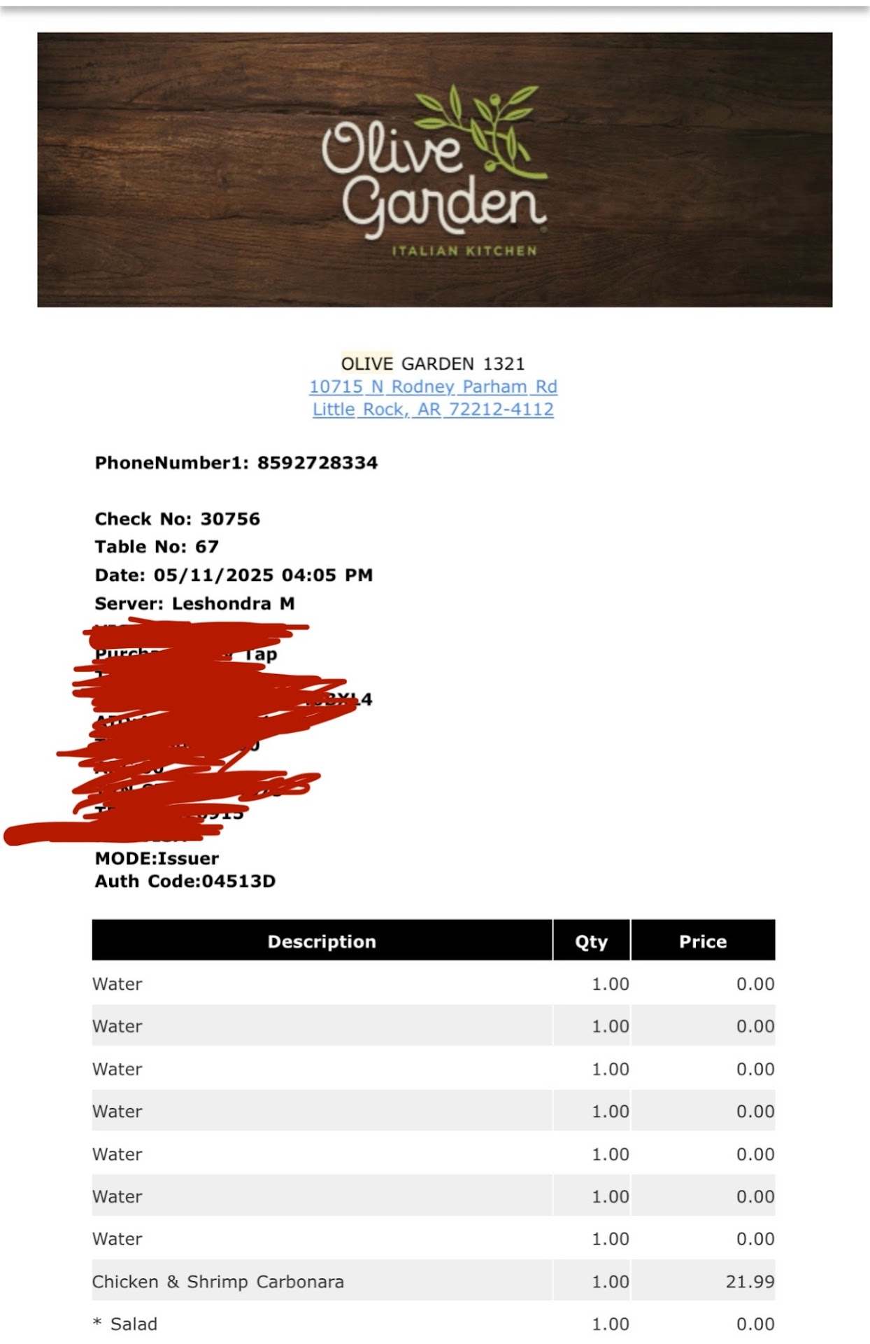 Read moreAfter anticipating our visit for my birthday for over a month I had a horrible experience and will never go back. I will drive to Hot Springs the next time I want Olive Garden, we walk in and immediately smell dirty bathrooms and I assume what supposed to be cleaner, the smell was overwhelming. After being pretty much ignored for several minutes we rudely get acknowledged and asked if we are waiting on a table. While being seated I dusted out the seat hat their was still food in, and out waitress approached us she was over all nice but slow and we had to constantly ask for refills they were never offered. We got ready to order and I had my mind set on something just to find out several mintires after I ordered that they didn’t have anymore. She gave me back the menu and I looked for something else I decided to get the tour of Italy thing, when she finally came back to take my order I told her what I wanted and explained that my husband was going to just have the fried mozzarella Because he doesn’t eat pasta, she finally bring out the salad and before I ever received my food I was brought the ticket and asked to pay? That’s new and honestly rude. When I receive the ticket I see that we were charged extra for salad I asked about it since it’s supposed to come with my entre and the waitress tells me she would have it taken off, so several minutes later a very unprofessional manager approached me and basically tells me because I shared my salad with my husband that we would be charged extra and she wasn’t going to take it off. Which doesn’t make since to me if I just bought a 20$ entre for myself and my husband got something of his own to eat even if it wasn’t an entre I should be able to share my food if I want and it’s never happened to us at any other Olive Garden. It would be different if that’s all he ate but it wasn’t. I decided not to argue with her because after all this was my birthday dinner, and agreed so she would go away. When I finally get my tour of Italy (while I have an empty drink) the chicken tasted like straight oil, the Alfredo was dry, and the tiny portion of lasagna was nasty also. My trip was horrible and definitely not worth the drive. I will never return to the location on Rodney...