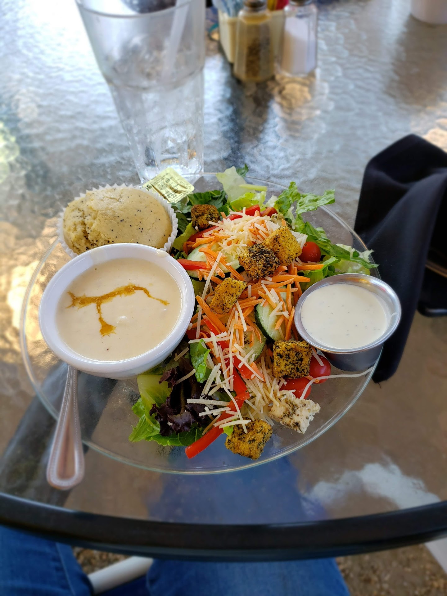 Years ago when I worked in Little Rock, Scallions Chicken Salad and Cheese Soup Special was my lunch time staple. I loved it. To this day, I can’t find anyone who makes chicken salad dressing as well as Scallions, and I’ve looked all over the world. This week on my visit to Little Rock and to satisfy my nostalgia, I stopped by for lunch again. The cheese soup and chicken salad dressing were marvelous as ever. Maybe my palate has changed with age, but the chicken was tougher than I like in chicken salad and the cream cheese in the finger sandwiches were a bit too salty, hence the four stars for food. In other reviews, I read that the alternative to finger sandwiches, poppy seed muffin, is very good so I just made the wrong choice.