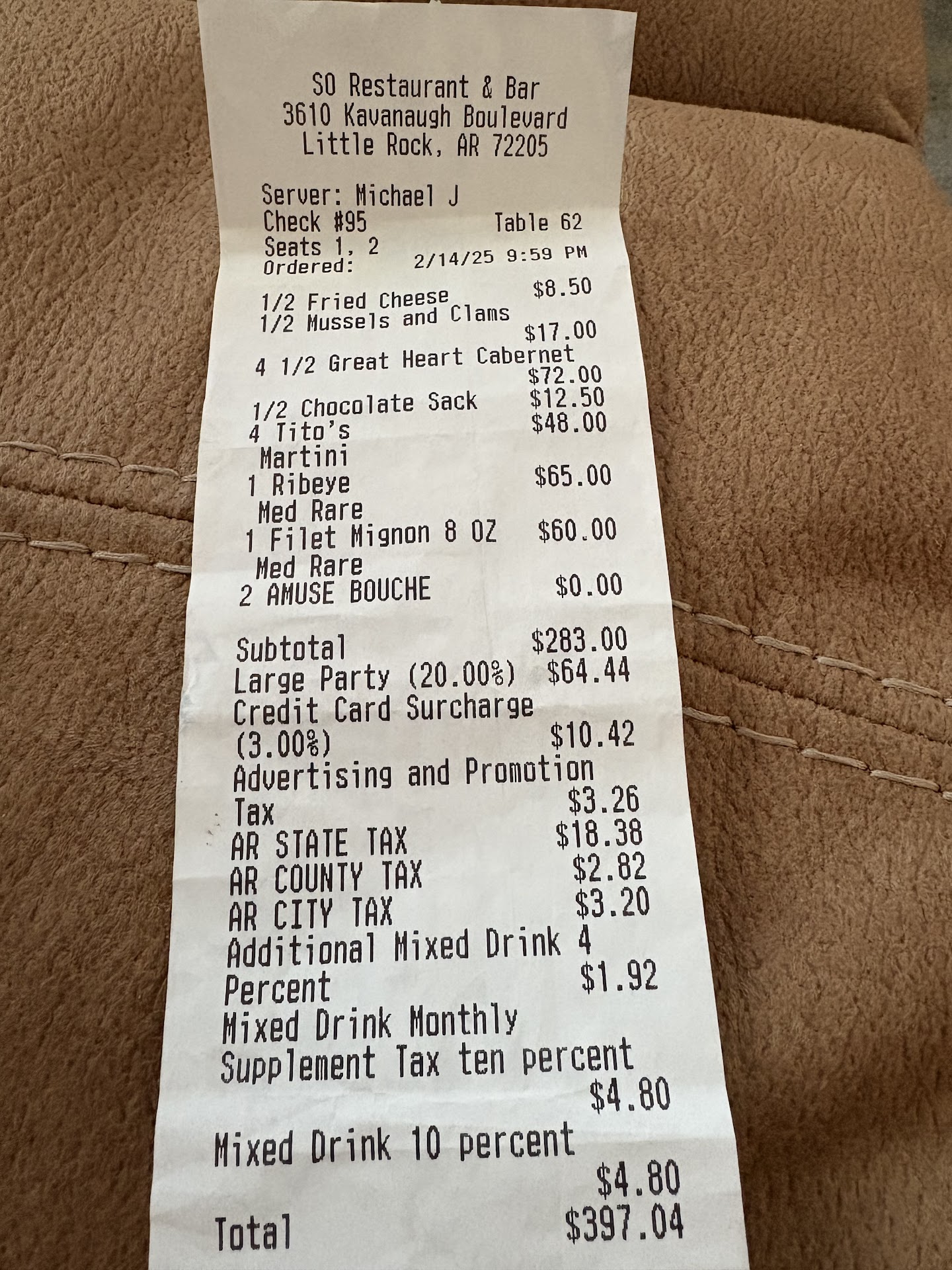 Read moreI typically would not post this type of review for the public to see. I contacted the restaurant in private, saw that they read my note and 48 hours later, still no response. So, here is the note I sent to SO Restaurant. “I visited your restaurant for the very first time last night, NYE. It’s a beautiful facility, charming and elegant. Our waiter was Brock. We had a 5:30 reservation for 6. We were seated promptly. We all ordered from the NYE limited menu. 5 of us got the oysters as our appetizer. The oysters were room temperature. It was an item that should be hot, melting cheese from being under the broiler. The oysters in the Bienville were very strong, fishy tasting/smelling. Very disappointing dish all around the table. The Turtle soup was ordered by most of us for the next course. It had good flavor, but has also room temp, not even warm. Again, very disappointing. Most of us ordered the prime rib for our main course. The mashed potatoes were divine, as was the asparagus with shaved yams. Delicious. The seasoning on the prime rib was excellent. The prime rib however, was also not warm, and mine was very, very tough. Difficult to cut. Just a terrible cut of meat. The desserts were hit and miss. Pineapple cake was great. The cheese plate was cold brie and a glob of apricot jelly. Just terrible. Never had cold brie cheese. The chocolate truffles were awful, dense, dry, hard, just awful. We ordered coffee and it took 3 times reminding Brock for us to get it, one in a dirty cup, and not hot. It was bad. It took 3 times asking Brock in order to get a glass of tea. Brock was frazzled, kind of high strung, odd. I wanted to inform you of our experience and I would never want to put this on public social media. We are all professional people and we eat at fine dining establishments often. Our tickets had a 20% tip automatically added in. I thought that was tacky. I felt this may have been the single most overpriced meal I have ever had then was forced to pay 20% for mediocre service from our waiter. I feel terrible even writing all this, but the owner of this establishment deserves...