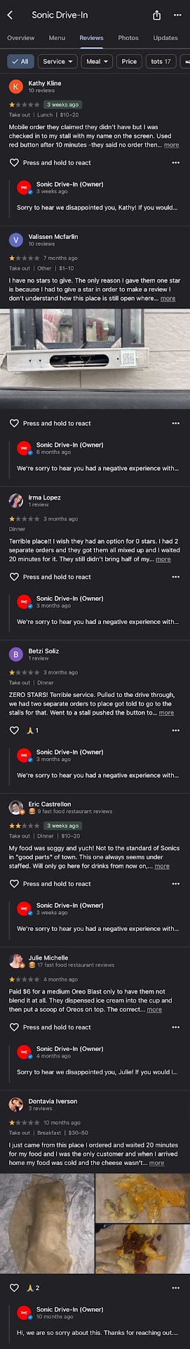 The best part about this Sonic is the carhops because most of them still smile, and don't mind running back in real quick if you need sauce that wasn't out in your bag, extra napkins, or anything like that. I try to always leave these hardworking girls a good tip because I know they earn it, but also because I'm sure they get a lot of complaints that really aren't their fault. The only reason I rated this Sonic a 3 and not a 1 is because of these young ladies! Something needs to be done to get those orders taken better, made faster, and...