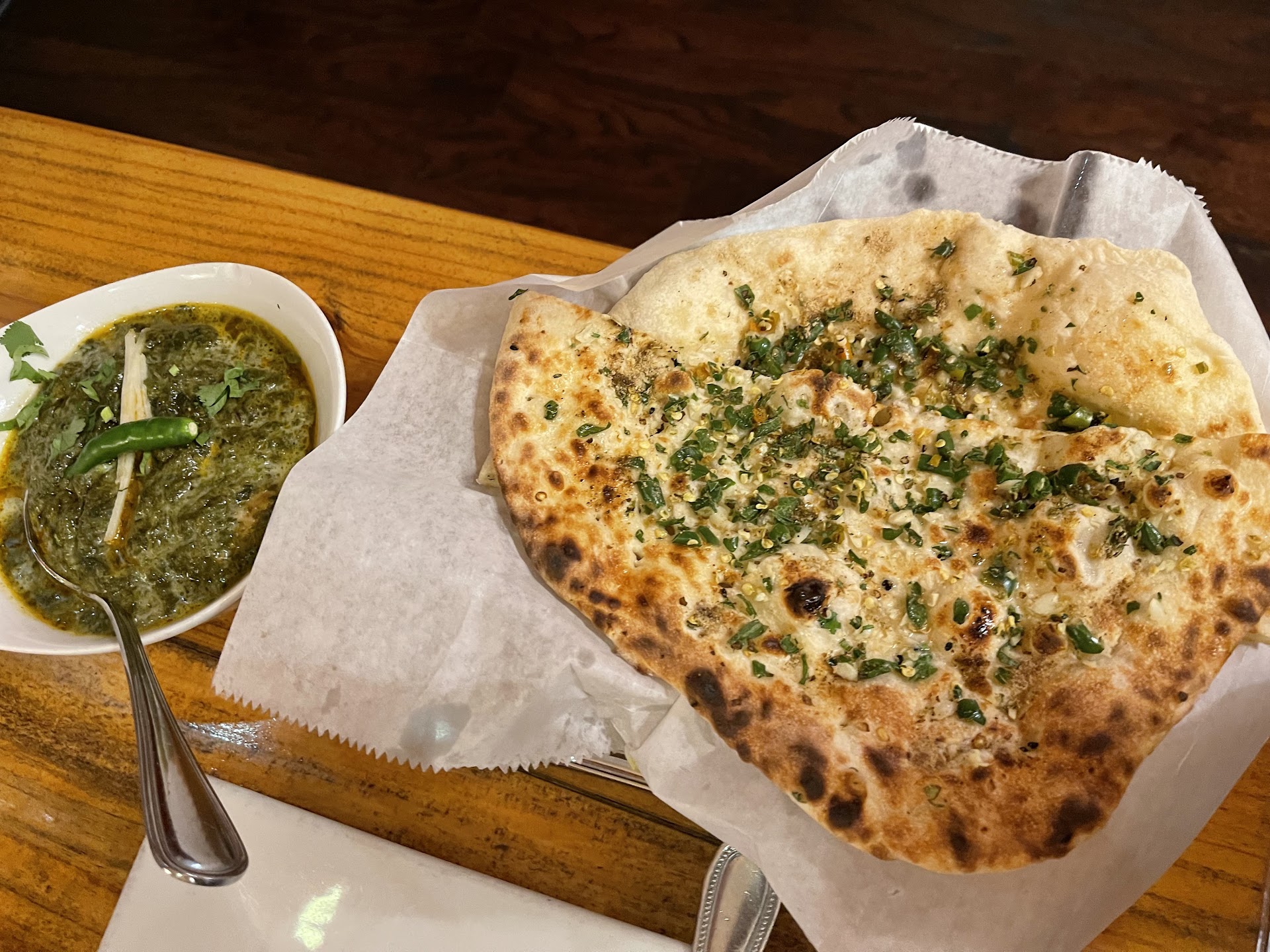 Vegetable Samosa - crispy, comfortable, delicious. Chili Chicken - first time ordering; moderately/medium spicy, hot, fresh really good, paired well with veggies, will order again Chicken Saagwala - first time ordering; "Indian" level spicy. Really enjoyed, very spicy -- induced some sweating. Paired with Bullet Naan. An intense time. Chicken Kadhai - first time ordering, paired with Garlic Naan. Medium/Heat, the spiciness really builds up at the end. Chicken was cooked very well, chewy, cooked tear it with your fork, curry sauce was very good, bell peppers added a fun crunch. Chicken Vindaloo - medium spice level - on par with the Chili Chicken. Very good, and good mixture of texture with chicken, potatoes, the gravy is definitely a bright tangy taste. Chicken Curry - first time ordering, medium spice level - really good sauce. Paneer Tikka Masala - Medium spice, comfort staple. Tomato gravy base is so good, but it does mellow out the spiciness. if you like it spicy up it to "Indian" level. Always enjoyed. LOVE IT. Aloo Gobi - Medium spicy, bright, flavorful mixture of vegetables and spices. You can really taste the brighter, fresh cilantro that makes the dish so good. Garlic Naan - O.G. staple. Can't go wrong, usually ordered every trip. The Naan isn't oily or too hard, fresh garlic and toppings. Kashmiri Naan - first ordering, dessert bread. Will order again. TABLE SIDE LAVA CAKE - So fun watching dessert being prepared table side. Cake was hot, chocolatey, and cool with creamy vanilla ice cream. What's not to like?