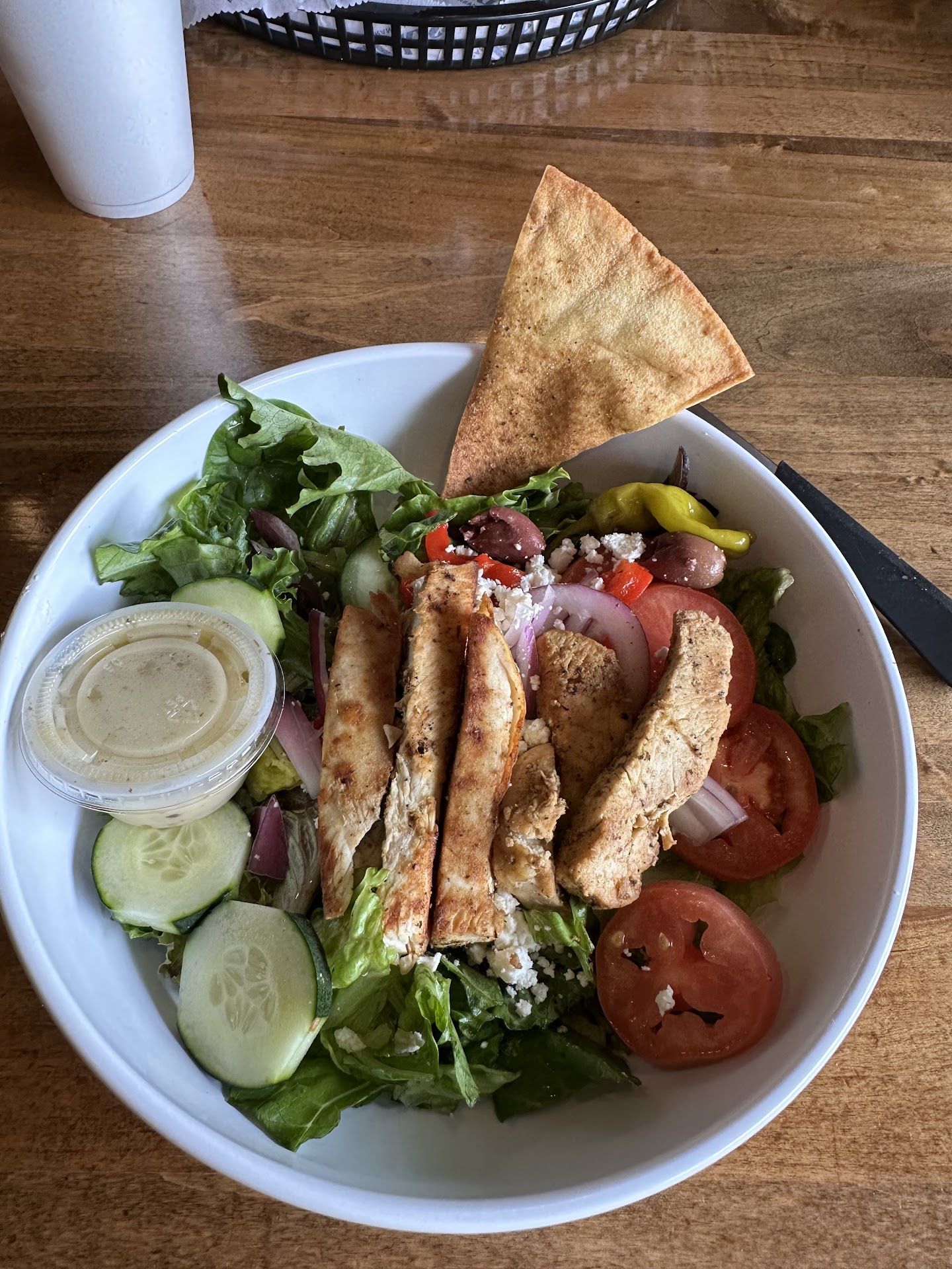 Read moreI've eaten @ other Taziki locations before, in different towns and other Little Rock locations. This is my 1st experience @ this one. Everyone seemed nice. Just left my heart doctor's office and was needing to eat healthy. I tried something new: Chicken Salad company. Price was more than I usually pay for lunch, anywhere. Chicken salad was good, nothing to write home about. Salad and dressing was ok. Fruit was alright. Pita was crunchy. I was halfway done eating my late lunch, when I noticed something I ordered was missing: the Pimento cheese. I went up to the counter and they were nice enough to give it to me and apologized for leaving it out. Pimento was okay. I asked my wife about her Beef Gyro. She said it was different and that she was disappointed. The cut of meat, beef, was different and tougher to chew. She didn't finish her lunch. We can't afford to eat out much, but this is the place she wanted to go to lunch. We probably will not come back, unless we forget...
