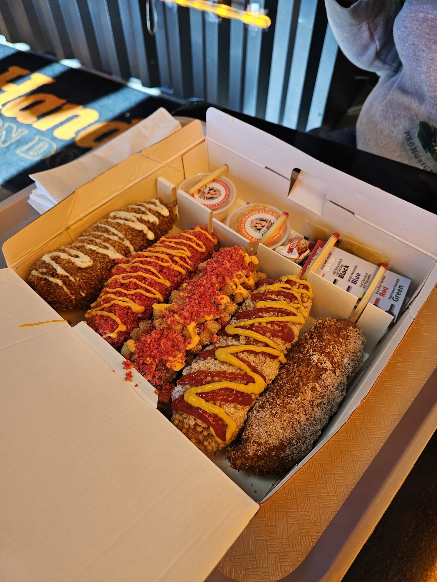 I'm giving an overall 3 star because of the quality of the food. My main observation is that the dough was too thick on all of the corndogs, causing part of it to be a little undercooked. We opted for the spicy on most, except for the 2 hands, I opted for the half cheese/half sausage. Due to the thickness of the dough, I feel like the cheese didn't melt like it's supposed to. The potatoes on the potato dog also tasted over fried, as if the oil used wasn't fresh.