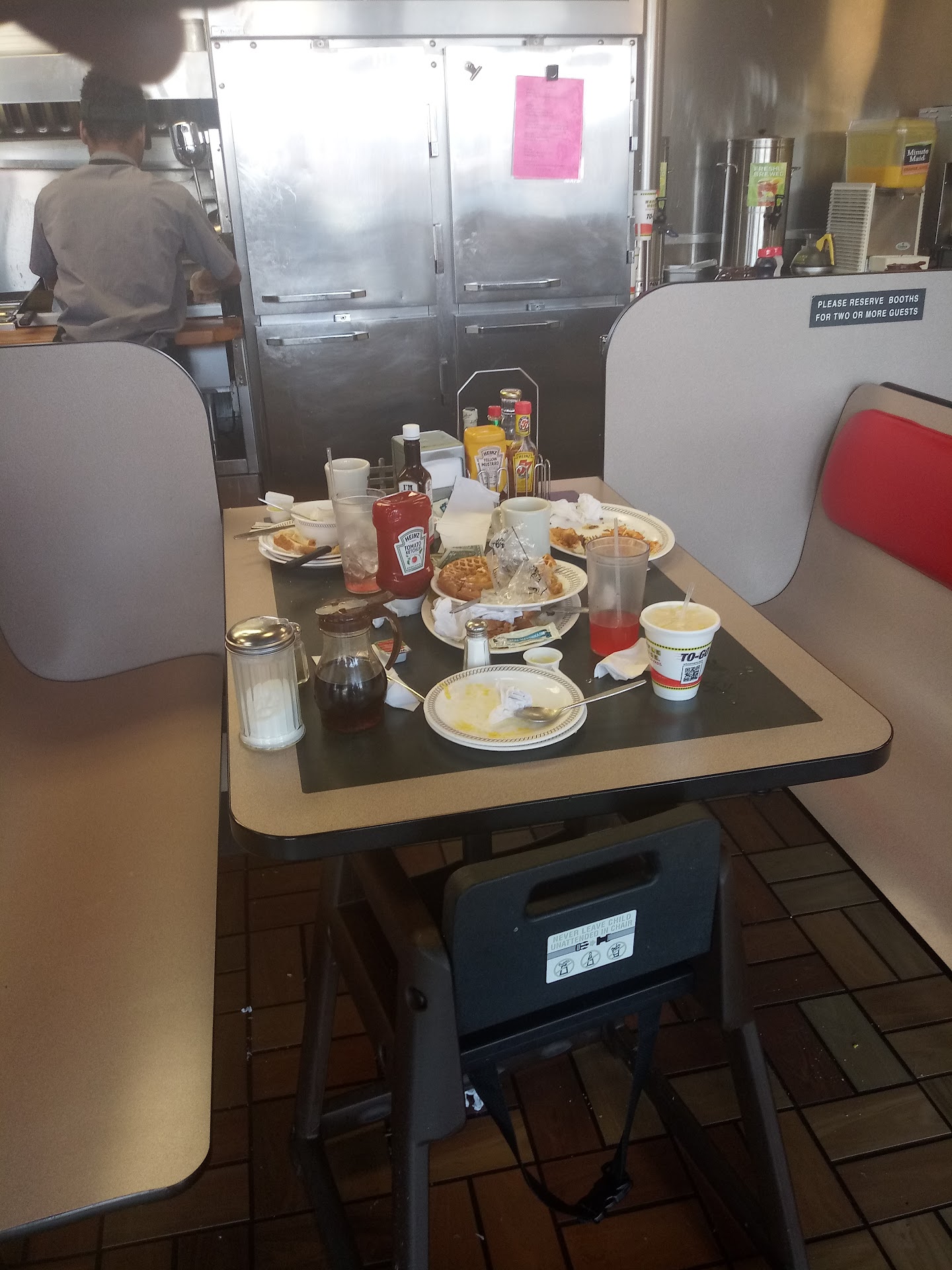 Read moreEntering the establishment, i saw that hardly any seats were clean (Should have been mty first sign). I was asked what I wanted to drink a couple minutes after sitting down, but it wasn't until the manager asked me ten minutes later what I wanted to order and what I wanted to drink. While waiting for those ten minutes I saw a woman asking for her grits, which she never even received. I saw another family sit for a few minutes and leave after getting no service. I really should have left, but I wanted breakfast. After getting my food, my waffle was cold and I wasn't given any butter, nor any ketchup or pepper. For whatever reason they put cheese on my eggs without asking. During the entire time I was eating (about 20 minutes) I was asked once, again by the manager, if I needed anything. However I had two bites of my waffle left so I said no. I will not be returning here, the wait staff was unorganized and can't handle the job, while the manager was lazily trying to hold together this place. I don't expect class when I go to waffle house, but I certainly expected...