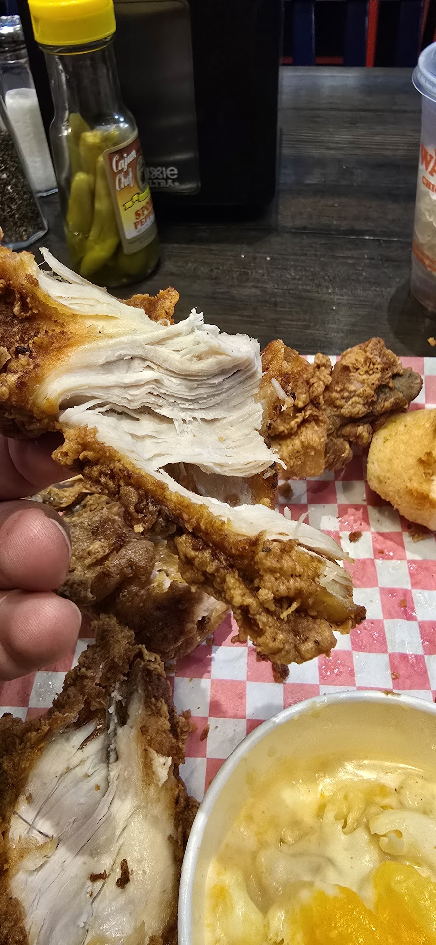 Read moreI went through the drive thru to purchase a half chicken, halfway down the street I thought I better look at this chicken one more time before I get all the way home. There was a piece of hair and a few eyelashes on this chicken!! I went back to the restaurant, showed it to the cashier and asked for my money back. She notified a manager and while he was processing my return, I noticed a cook, standing IN THE KITCHEN waiting on orders, picking his teeth with a toothpick!! I mean digging, sucking his teeth and digging again. He walked over touched the monitor that I assume displays orders and walked back to where he was standing. I asked the manager does he think it’s ok for him to pick his teeth while he’s cooking, the manager turned around and looked at the guy, looked back at me shrugged his shoulders and said I mean we wash our hands and wear gloves when we handle food. I said O ok, got my receipt and ran out of there. I can not believe a so called Manager thinks that his employee is ok standing in the kitchen, picking his teeth with a toothpick!! I will NEVER eat there again and I am highly...