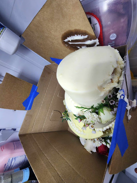 I called and spoke to the decorator and was extremely specific on the location of their wedding- Which was in Breckenridge! 1.5-2 hours away, to which the decorator was aware. I instructed her NOT TO STACK THE CAKE because of the long drive, and she agreed knowing the lengthy travel time. Unfortunately, they wouldn't deliver to their location. This was the condition the cake arrived in because THE CAKE WAS STACKED AND PUT TOGETHER when they picked it up. Neil, the owner had mentioned that there was NO OPPOSITION from them when they picked up the cake. There couldn't be, they had NO IDEA what I had designed or anything!