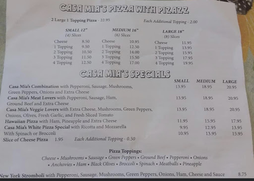 Saw Casa Mia's & decided to give it a go as I'm always in the mood for good pizza. We decided to dine in as opposed to grabbing the food & heading back to the RV. Regrettably the inside of the restaurant is tired & depressing, looks like it could've used a major facelift a couple of decades ago. But as looks can be deceiving (The Pointe Restaurant had great location & views but God-awful food) what Casa Mia's lacked in ambiance, they made up for with their pizza. We ordered Hot Wings to start; they tasted fine but you could tell they were store bought frozen battered baby wings. The pizza however was very tasty, a really good crust & the tomato sauce had a...