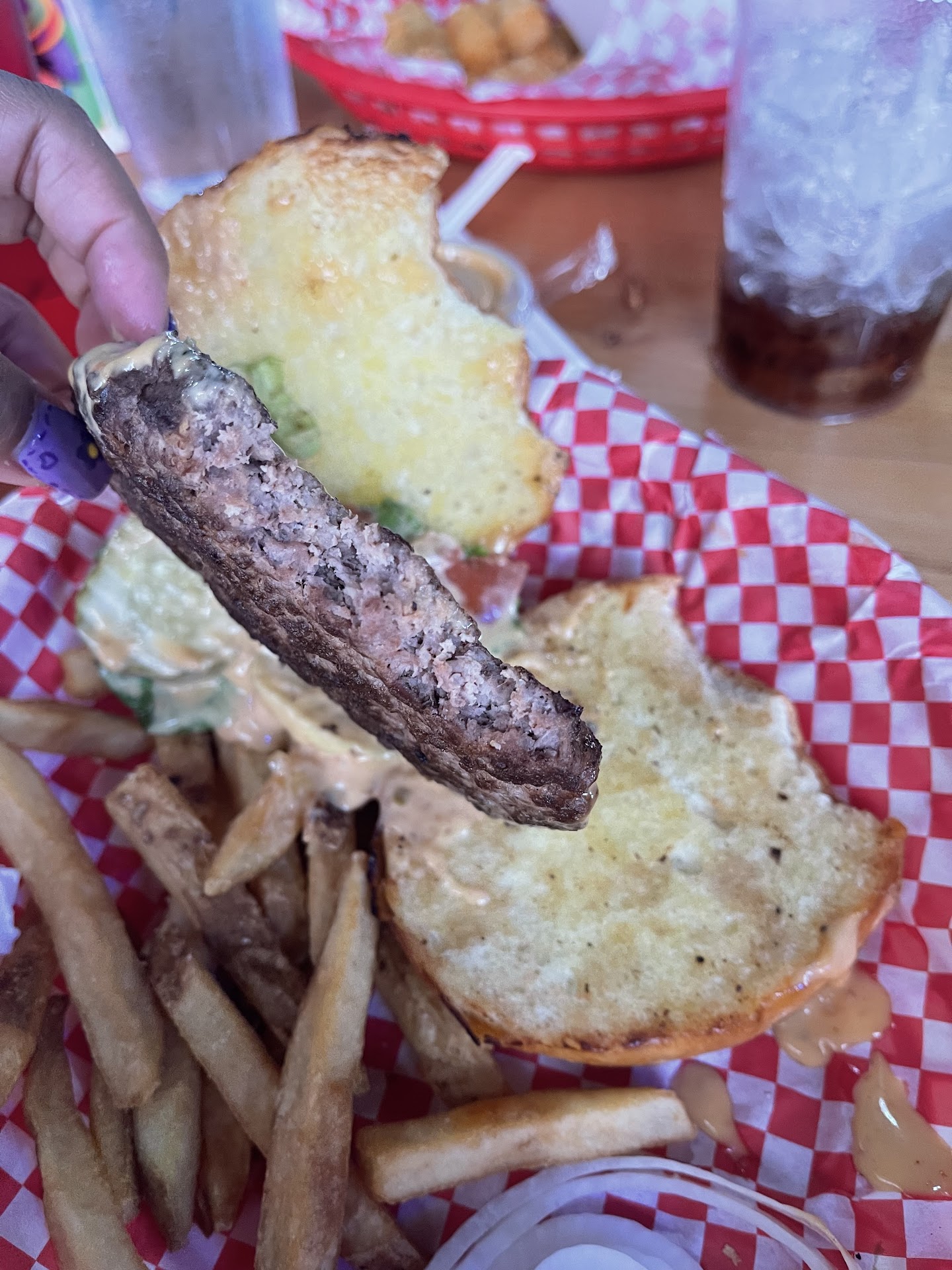 The burger was "meh" at best. The fries weren't much better. I really couldn't believe that burger (with fries) cost $12. In fact, everything on the menu was ridiculously overpriced in my opinion. I could have bought a better burger at Goodtimes or even Carl's Jr for half the cost and a much better taco at a local Mexican place.