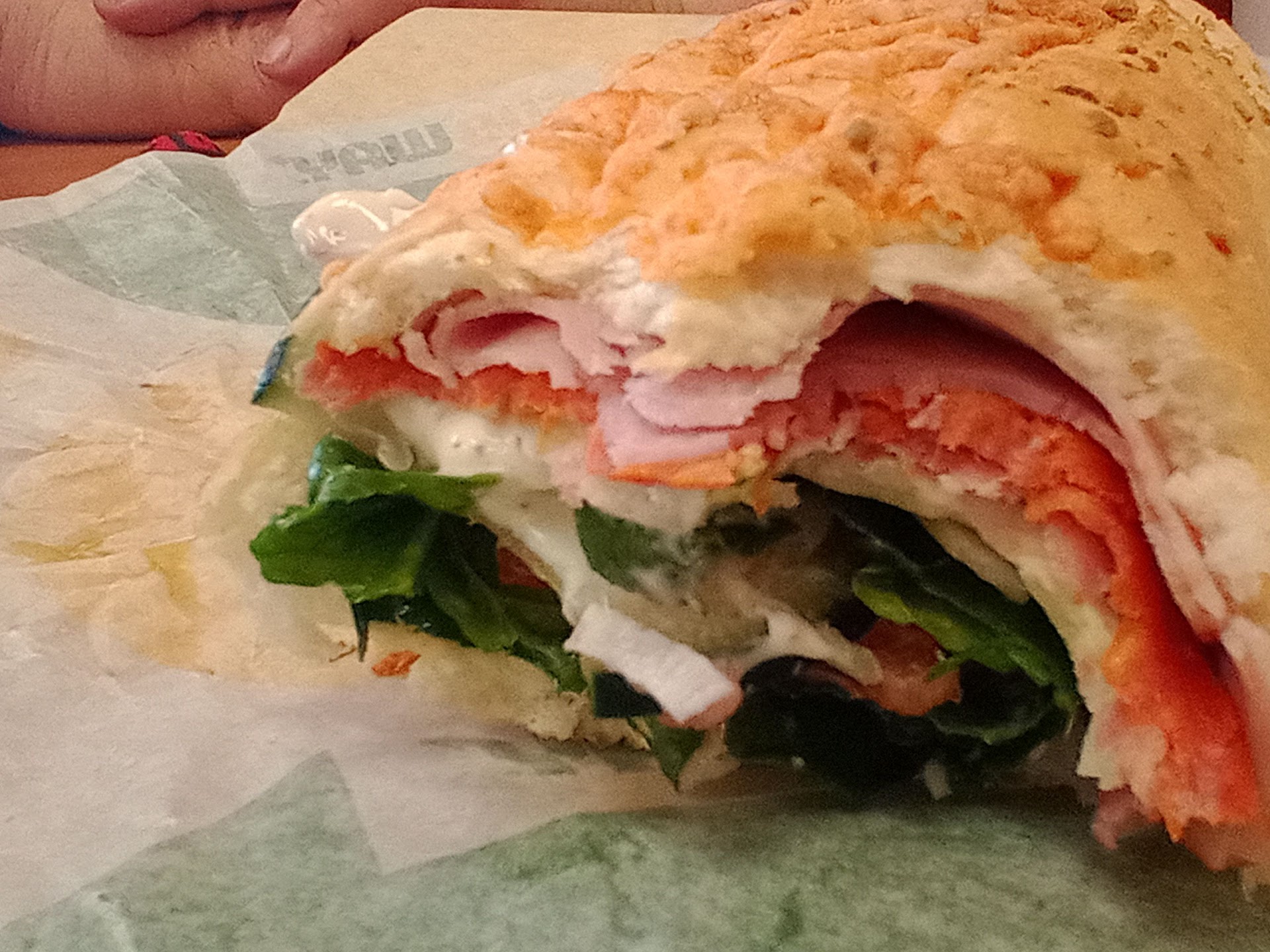 When I got to veggies I was so disappointed in my experience. The brunette was nice and all but she so obviously hates her job and it's reflected in her sandwiches. Everything was thrown on there sloppily and in mismatched portions. I shouldn't have double the amount of lettuce on one half of the footlong and not the other. Cucumbers go end to end... not all stacked on each other and also mostly on one half. 3 strips of dressing on each sandwich, not one. I can't taste my dressing and was scared to ask for "extra" (what should've been a normal amount) cause I didn't want to have 6 lines of dressing instead and not be able to taste anything but mayo. When you cut the sandwiches you reallllly gotta at least try to push everything into the bread. Cause my one line of mayo and all the rest of my full price sandwich (it's not overfull it's normal size) is currently more in the bag than it is in the bread.