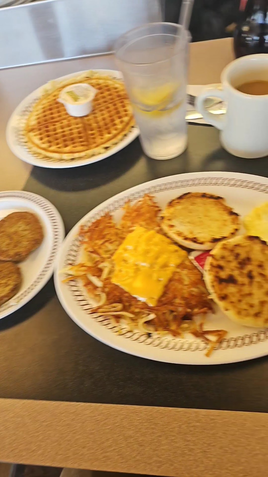 Read moreThought Waffle House would be a great breakfast to start the day, how could you go wrong right? Well, went in and sat in the corner window which apparently doesn’t get air flow because it was so hot I was sweating. I almost thought the AC was broken but as we went to pay I could feel some air. Don’t sit near windows I guess the AC is not strong enough to keep it cool even with the shades down like they were. Got to looking at the air vents and with how dirty the ceilings are in that place I’m sure the AC is struggling. Our waitress was ok, spent a lot of time socializing at the bar, the coffee was horrible and our food was cooked poorly. The hash browns were barley browned while the bacon was literally black from being burnt. We both felt sick the rest of the day. They got busy right when we came in, but the food was just horrible and that shouldn’t be the reason. I had just visited another Waffle House not too long ago, and it was great! Disappointed in this location- not giving up on Waffle Houses all together, but will not come back to this...