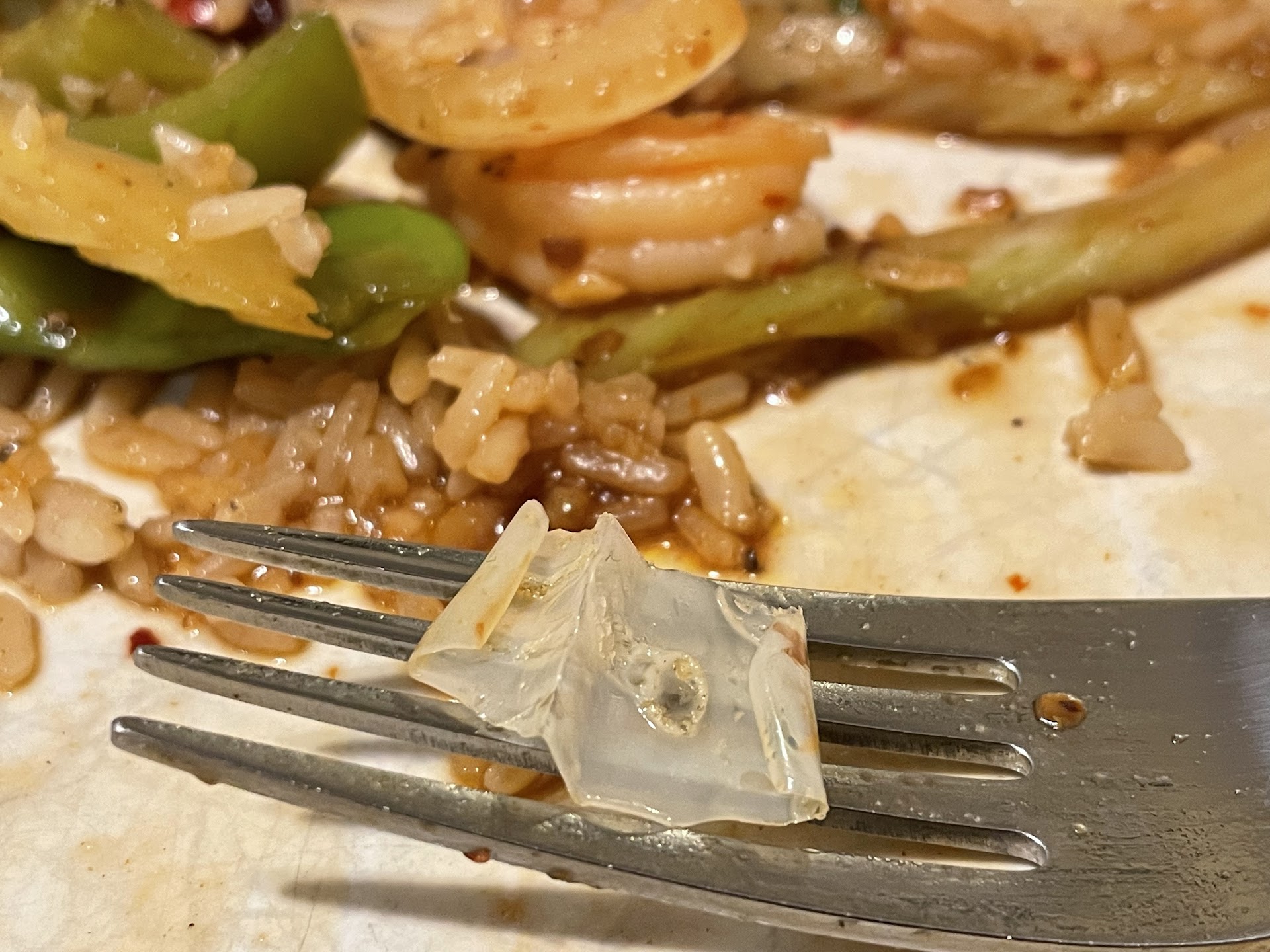 Our food was bland, not flavorful, tiny and greasy egg rolls, some veggies in my Kung Pao were not fresh (mostly the peppers were spotty and soft). The sesame chicken also soft and subpar. I was also greeted with this large plastic thing (see pic) in my mouth upon having a bite of my Kung Pao Shrimp. Needless to say I didn’t finish my meal, who knows what other trash was in there..
