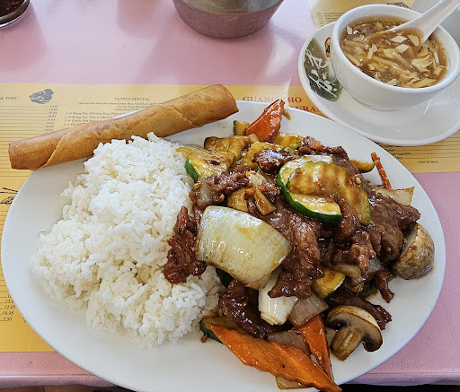 Very inexpensive lunch specials were tasty enough, though the soup that came w.it was inedible (clear vinegary soup w.bamboo slices & tofu), long cabbage filled egg roll was ok, Beef in Black Bean Sauce & Ginger Beef were indistinguishable but both were good, lots of food, nice stir fried crunchy fresh vegetables, hot steamed white rice. Hot tea was fresh & good. Utensils & plating needs to be replaced.