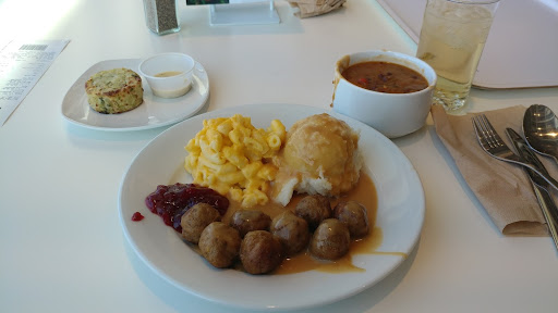 The cafeteria is a classic grab a tray and utensils, lunch lady place except the food is actually tasty. I don't eat the meatballs anymore even though they're yummy AF but they give me hellacious gas so the trade off is not worth it IMHO. The other stuff like salmon, chicken and fries are on point. The layout is kind of confusing, it's not clear which way you should enter and you might find yourself looking around. Look for the spot where the trays, cups and utensils are and that's the flow/direction you should go.